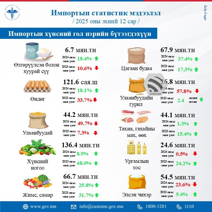 Түүнчлэн импортоор оруулсан бараа, түүхий эдийн нийт дүн 11.3 тэрбум ам.долларт хүрсэн бөгөөд энэ нь өмнөх оны мөн үетэй харьцуулахад 302.6 сая ам.доллараар буюу 2.6 хувиар буурсан үзүүлэлт юм.