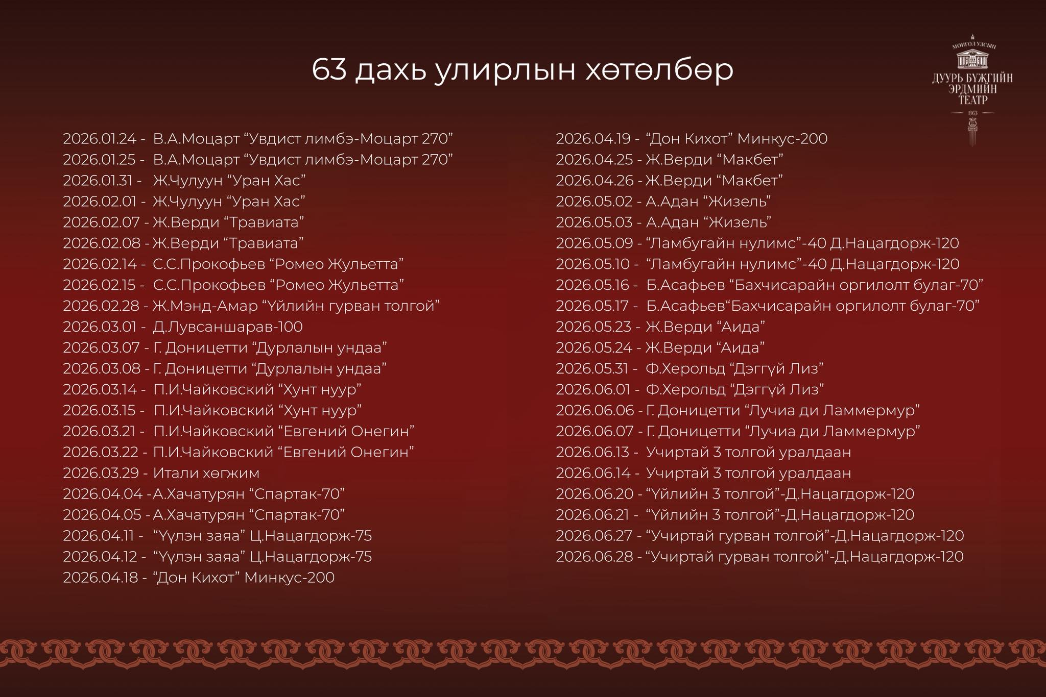 Улсын Дуурь, Бүжгийн Эрдмийн Театрын 63 дахь улирлыг дуустал тоглогдох үндсэн тоглолтуудын хуваарь зарлагдлаа.