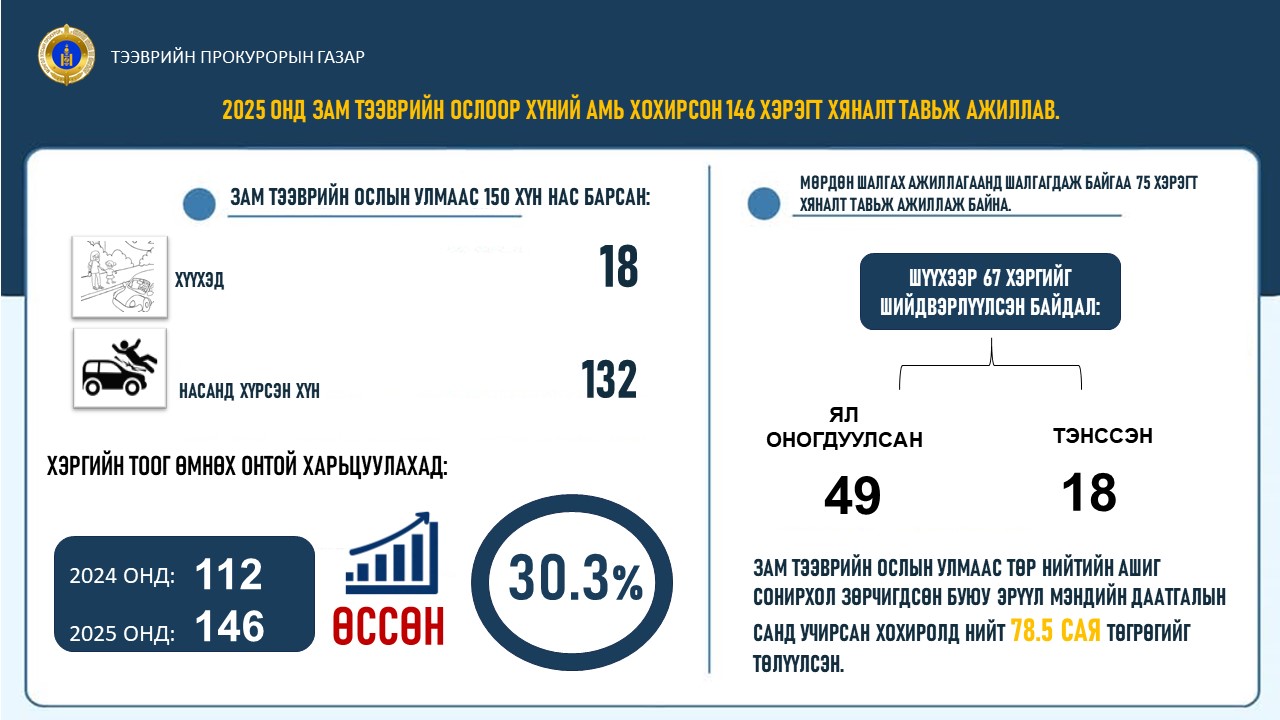 Тээврийн прокурорын газраас зам тээврийн ослын улмаас хүний амь нас хохирсон гомдол, мэдээлэл, эрүүгийн хэрэгт хяналт тавьж, шүүхэд шилжүүлсэн хэргээс анхан шатны шүүх 18 хэрэгт тэнсэх, 49 хэрэгт ял оногдуулж шийдвэрлэсэн байна. Одоогоор 75 хэрэг шалгах ажиллагаа хийгдэж байна.