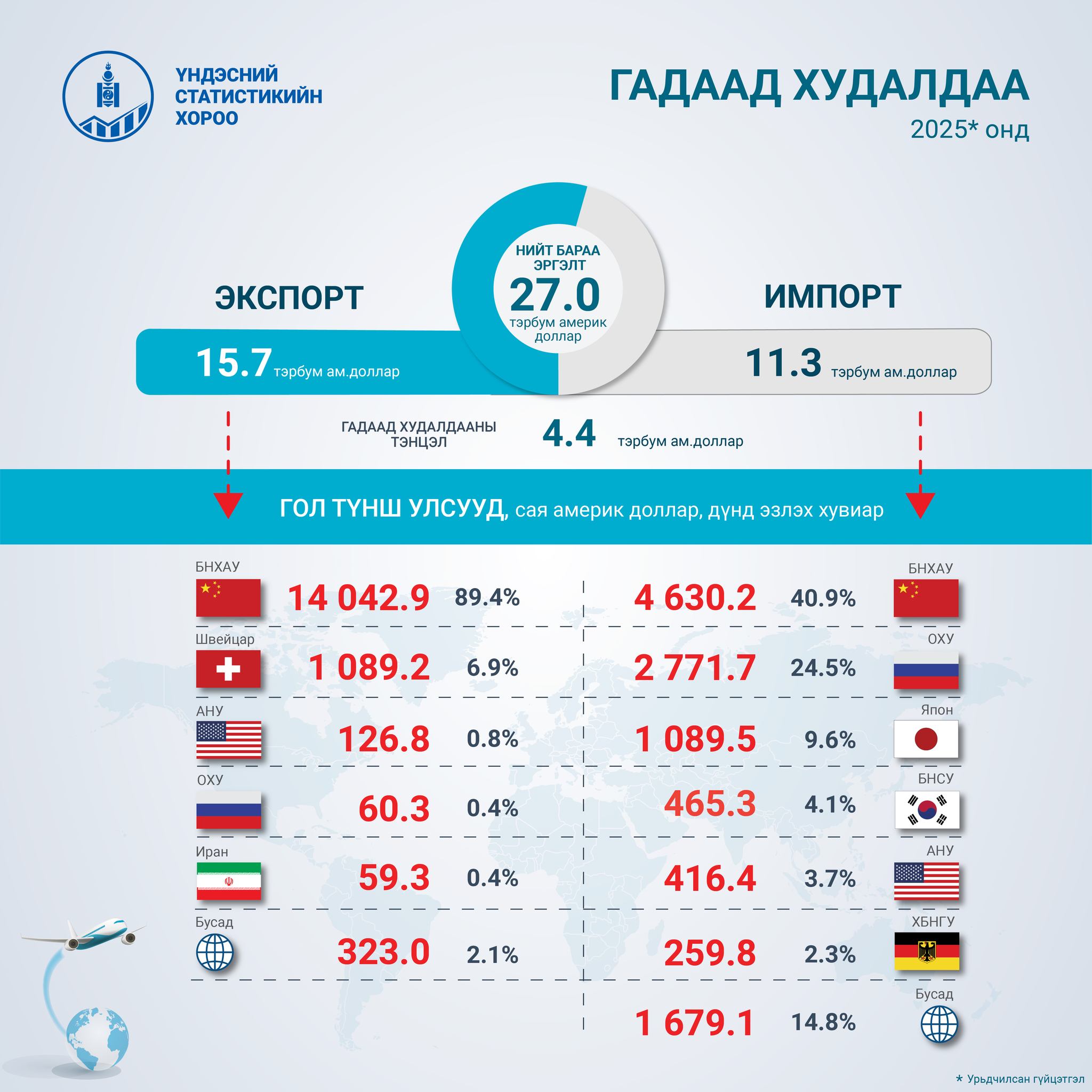 Монгол Улс 2025 онд нийт 163 улстай худалдаа хийж, гадаад худалдааны нийт бараа эргэлт 27.0 тэрбум ам.доллар болсон байна. Үүнээс экспорт 15.7 тэрбум ам.доллар, импорт 11.3 тэрбум ам.доллар болж, тэнцэл 4.4 тэрбум ам.долларын ашигтай гарчээ.