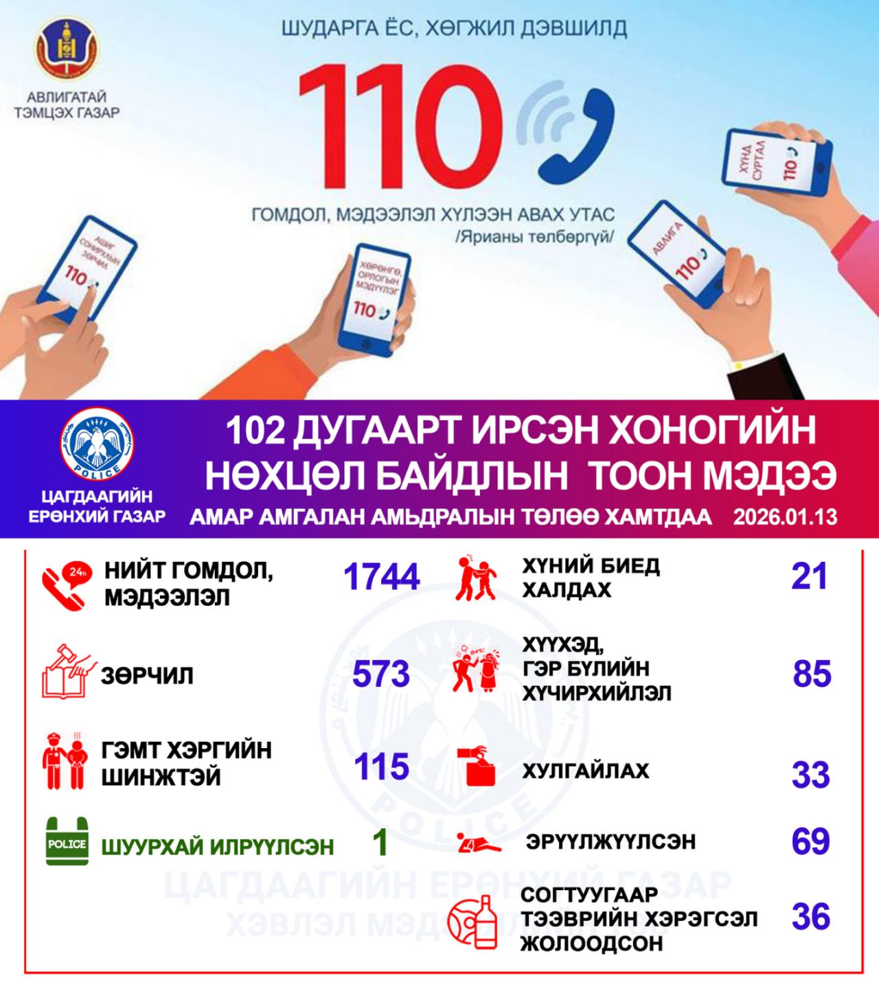 Цагдаагийн байгууллагын 102 тусгай дугаарт 2026 оны нэгдүгээр сарын 12-ны өдөр нийт 1744 дуудлага, мэдээлэл бүртгэгдсэнээс зөрчлийн шинжтэй 573, гэмт хэргийн шинжтэй 115 дуудлага, мэдээлэл байна.