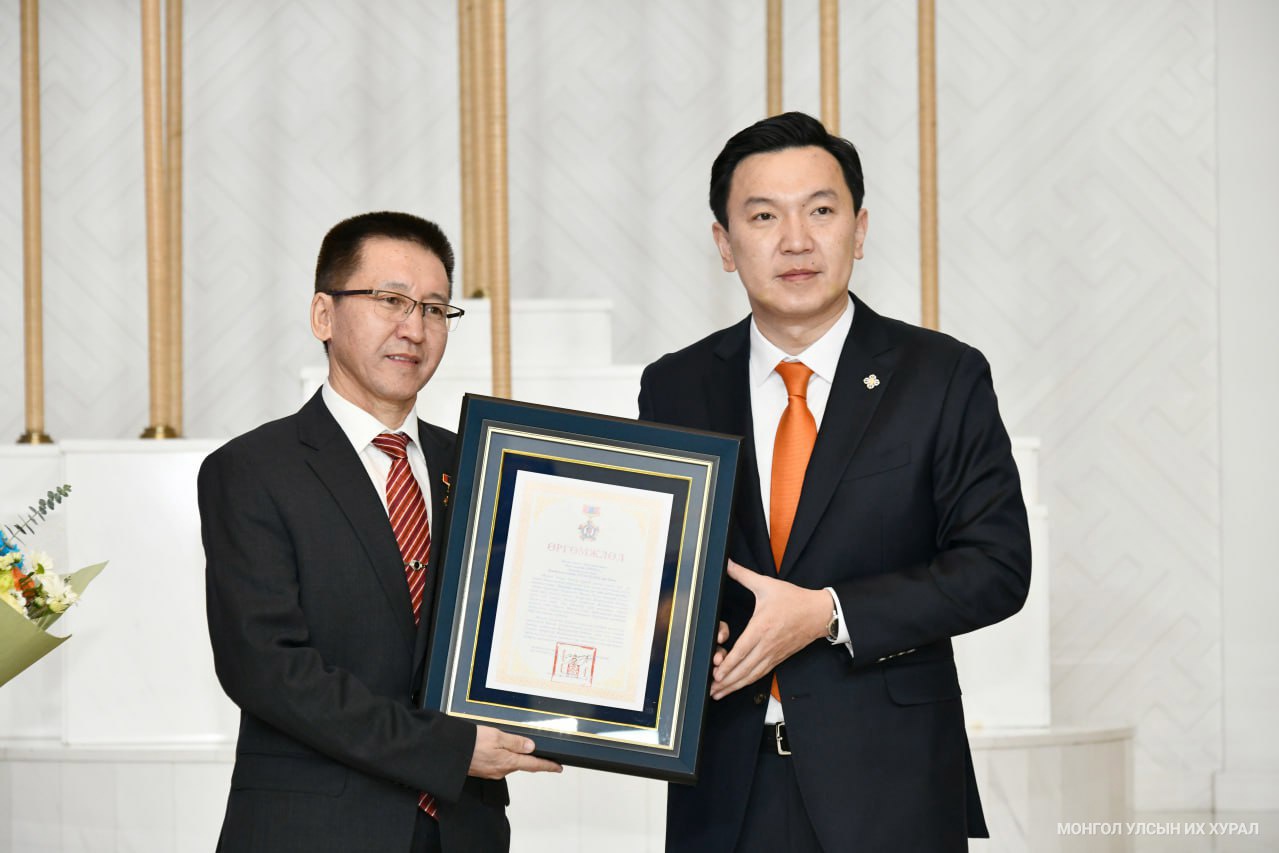 Ийнхүү Монгол Улсын Гавьяат хуульч, хууль зүйн ухааны доктор, профессор Жавхлангийн Бямбаа, хууль зүйн ухааны доктор, профессор Жамбаачүлтэмийн Эрхэсхулан нарт шагналыг хүртээж, өргөмжлөл, Б.Чимидийн дүрс бүхий медалийг Улсын Их Хурлын дарга Н.Учрал гардууллаа.