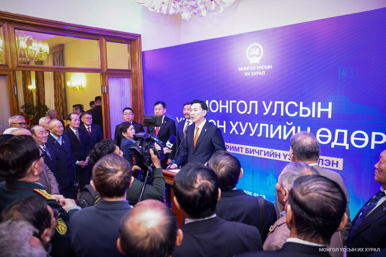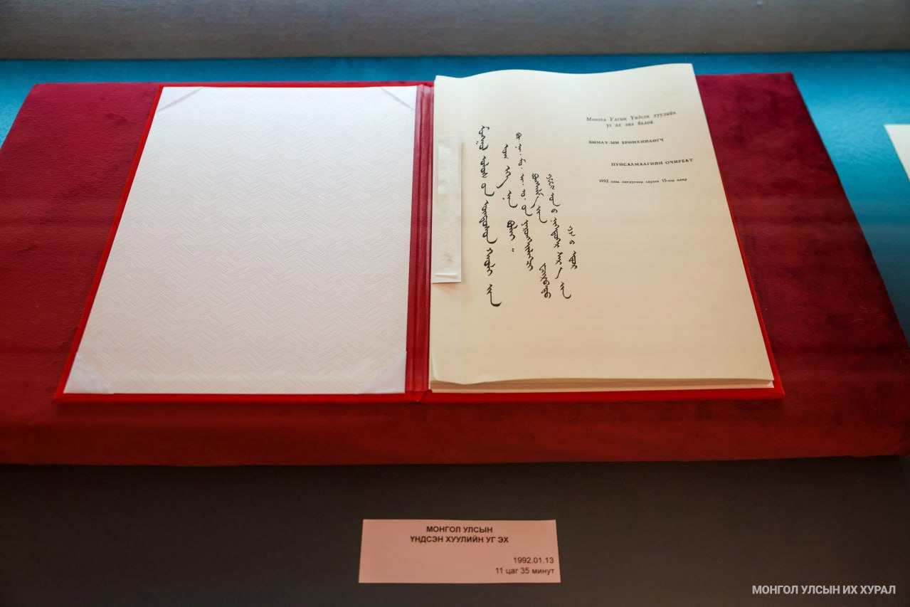 Үзэсгэлэнг өнөөдөр /2026.01.13/ Улсын Их Хурлын дарга Н.Учрал нээн үг хэлсэн юм. Тэрбээр өдгөөгөөс 34 жилийн тэртээ манай улсын засаг захиргааны бүх нэгжийг төлөөлсөн 430 депутат эх орон, ард түмнийхээ язгуур эрх ашгийг гүнээ эрхэмлэн дээдэлж, алжаал ядралыг умартан, хоёр сарын хугацаанд оюун ухаанаа уралдуулан байж Ардчилсан шинэ Үндсэн хуулиа хэлэлцэн баталсан. Шинэ Үндсэн хуулиараа бид Монгол Улс бол ардчилсан улс болохоо, ардчиллын замаар цаашид тууштай замнахаа дэлхий ертөнцөд зарлан тунхаглаж, хүний эрх, эрх чөлөө, шударга ёс, тэгш байдал, үндэсний эв нэгдлийг эрхэмлэсэн хүмүүнлэг, иргэний, ардчилсан нийгэм байгуулахаа илэрхийлж, улс үндэстнийхээ тусгаар тогтнол, бүрэн эрхт байдлыг тамгалан баталгаажуулсан гэдгийг онцлон дурдав.