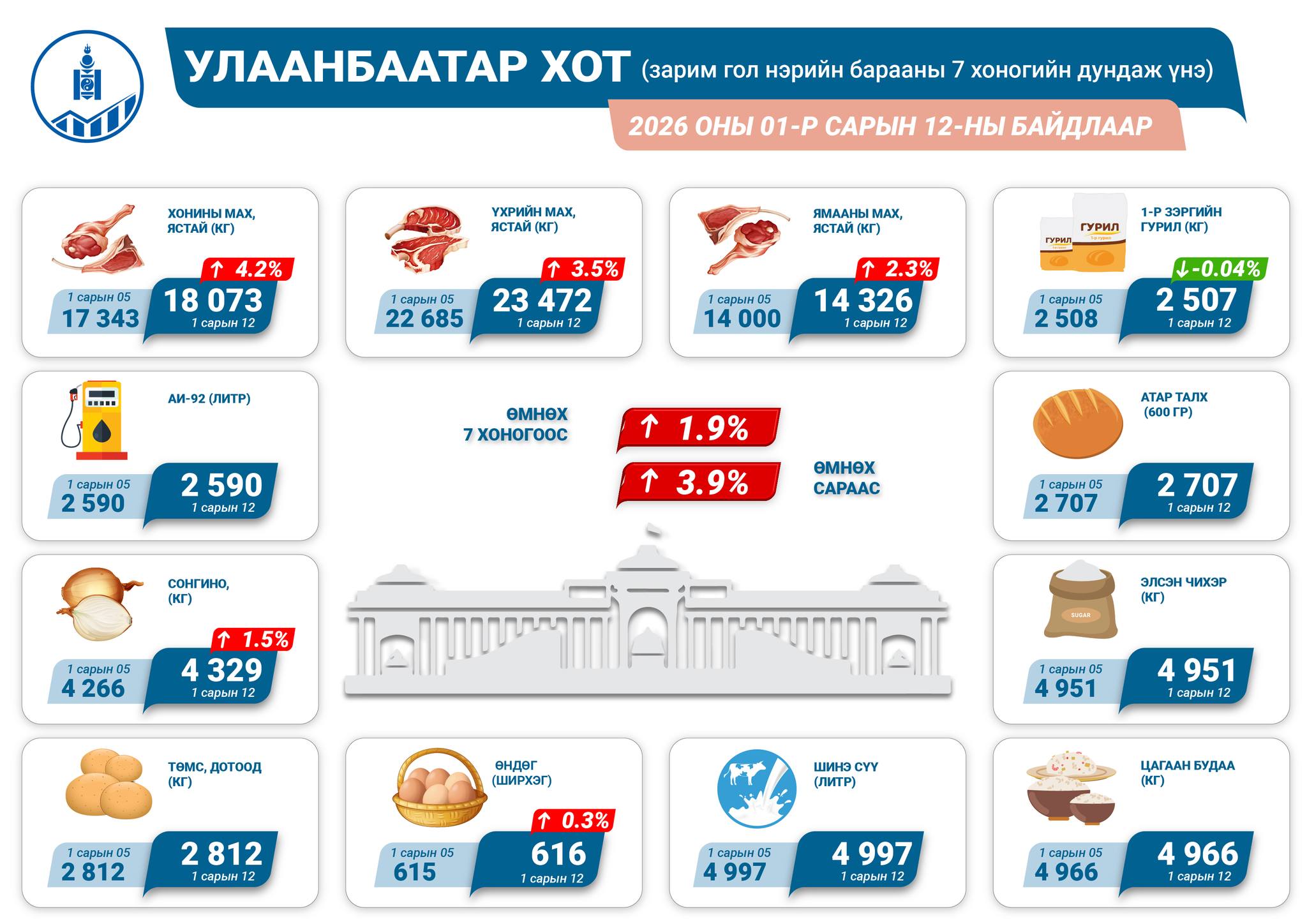 Улаанбаатар хотод 2026 оны 1 дүгээр сарын 12-ны байдлаар гол нэрийн зарим барааны үнэ өмнөх сараас 3.9 хувь, өмнөх 7 хоногоос 1.9 хувиар тус тус нэмэгдсэн байна.