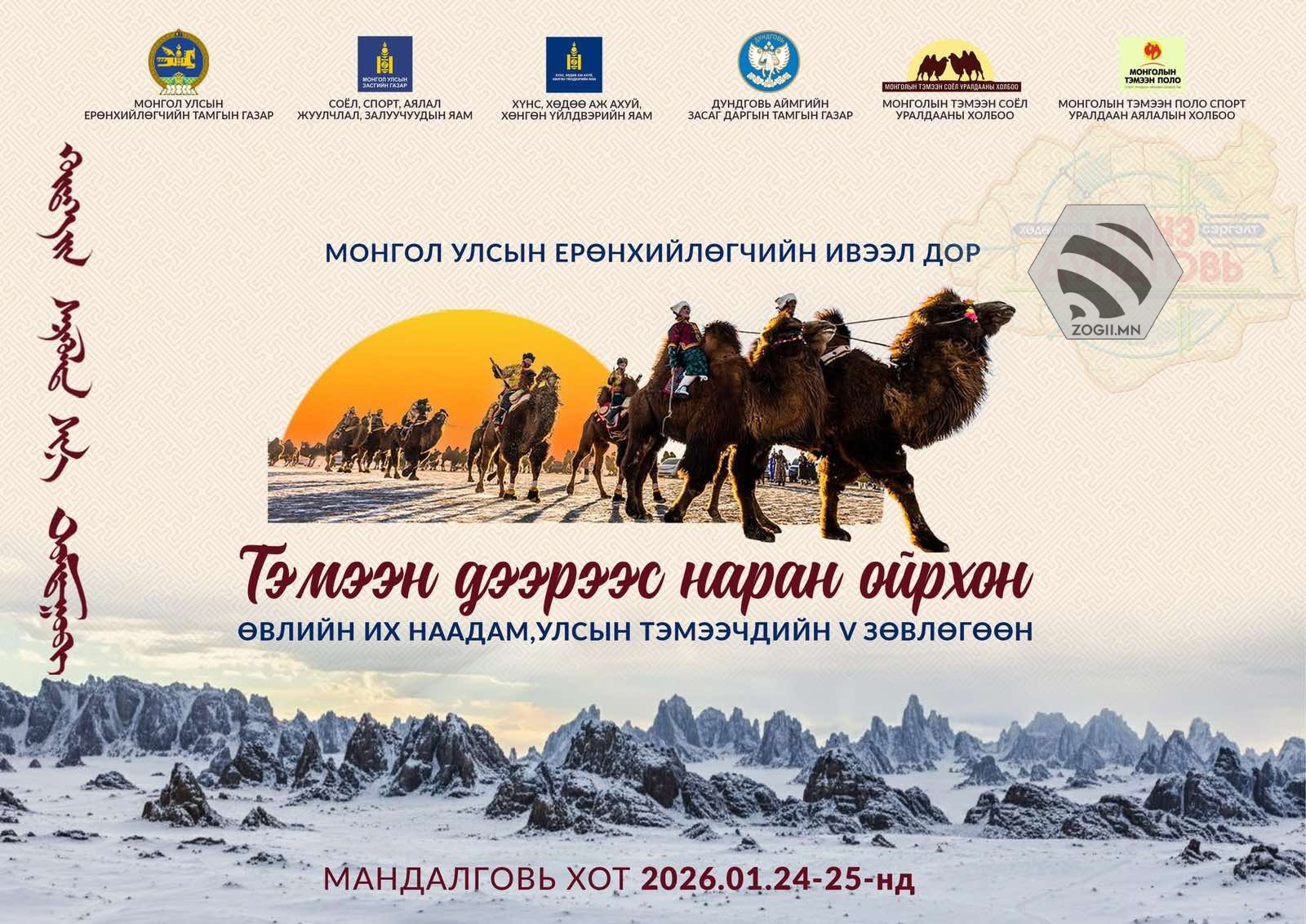 Монгол Улсын Ерөнхийлөгчийн ивээл дор “Тэмээн дээрээс наран ойрхон” Өвлийн их наадам, Тэмээчдийн V зөвлөгөөнийг 2026 оны нэгдүгээр сарын 24-25-нд Дундговь аймгийн Мандалговь хотноо зохион байгуулах гэж байна.