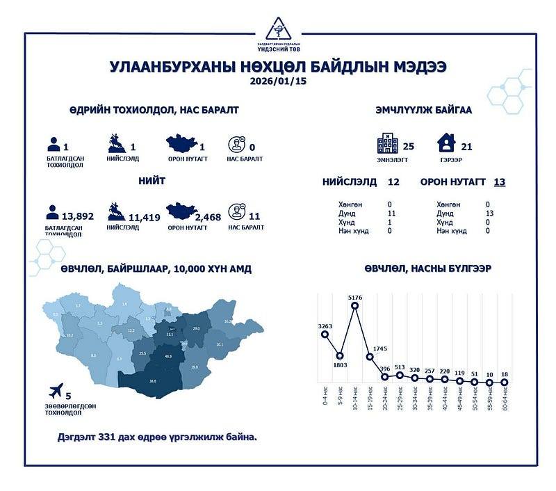 Халдварт өвчин судлалын үндэсний төвөөс гаргасан 2026 оны нэгдүгээр сарын 15-ны мэдээллээр Улаанбурхан өвчний батлагдсан тохиолдол нэгээр нэмэгджээ. Эмнэлэгт 25 хүн хэвтэн эмчлүүлж байгаа. Тухайлбал, ХӨСҮТ-д 12 хүн, хөдөө орон нутагт 13 хүн хэвтэн эмчлүүлж байгаа аж. Харин гэрийн хяналтад 21 хүн байна.