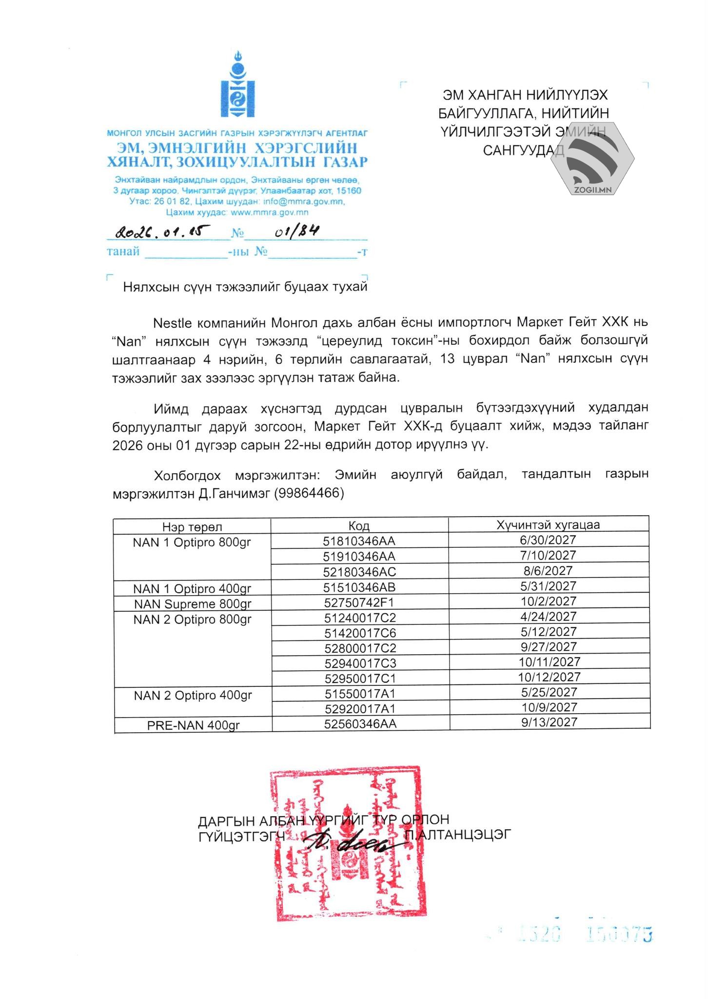 Nestlé компанийн Монгол дахь албан ёсны импортлогч “Маркет Гейт” ХХК-аас ирүүлсэн мэдээллийн дагуу “NAN” нярайн сүүн тэжээлд цереулид токсин илэрсэн байх болзошгүй шалтгаанаар зарим нэр төрлийн бүтээгдэхүүнийг зах зээлээс эргүүлэн татах арга хэмжээ авч байна.