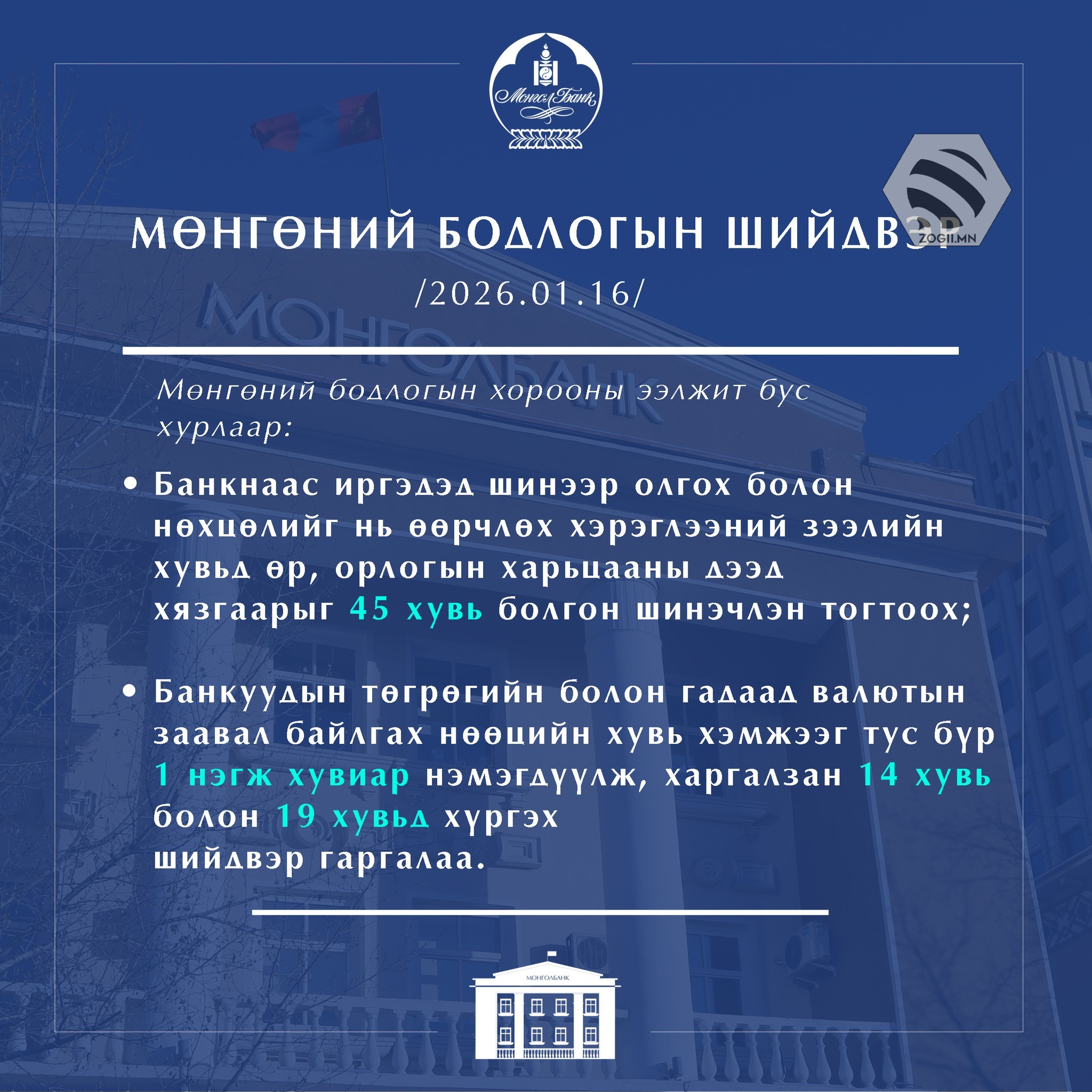 - Банкуудын төгрөгийн болон гадаад валютын заавал байлгах нөөцийн хувь хэмжээг тус бүр 1 нэгж хувиар нэмэгдүүлж, харгалзан 14 хувь болон 19 хувьд хүргэх.