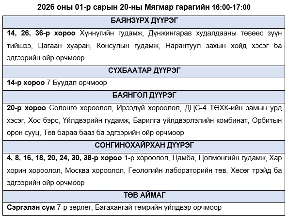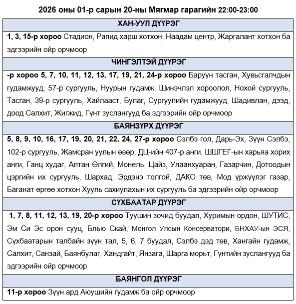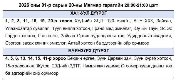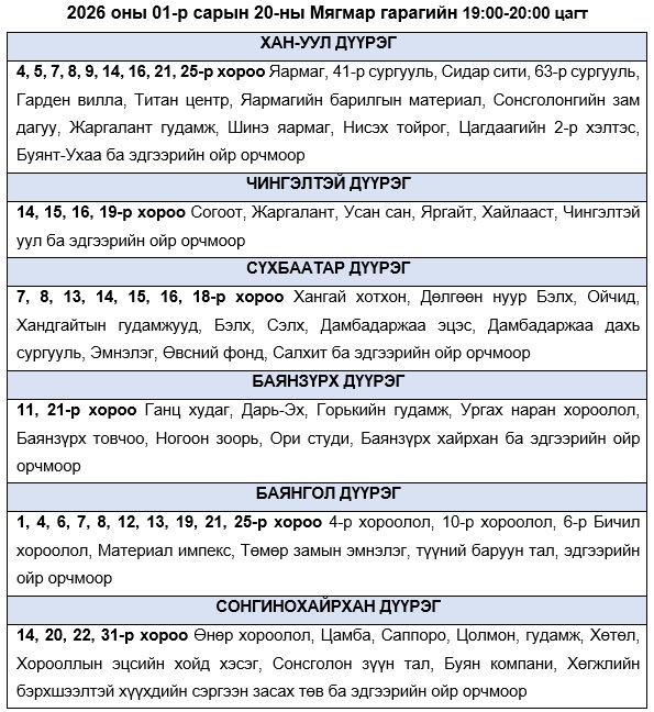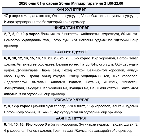 Эрчим хүчний чадлын дутагдлаас шалтгаалан өнөөдөр буюу 2026 оны 01-р сарын 20-ны Мягмар гарагт хязгаарлалт хийж “БОЛЗОШГҮЙ” байршлуудын хуваарийг танилцуулж байна.