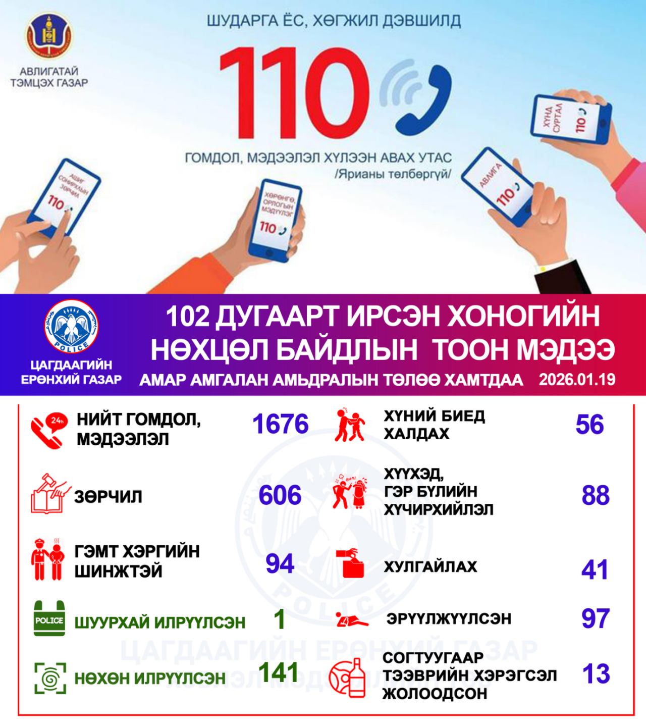 Цагдаагийн байгууллагын 102 тусгай дугаарт 2026 оны 01 дүгээр сарын 19-ний өдөр нийт 1676 дуудлага, мэдээлэл бүртгэгдсэнээс зөрчлийн шинжтэй 606, гэмт хэргийн шинжтэй 94 дуудлага, мэдээлэл байна.