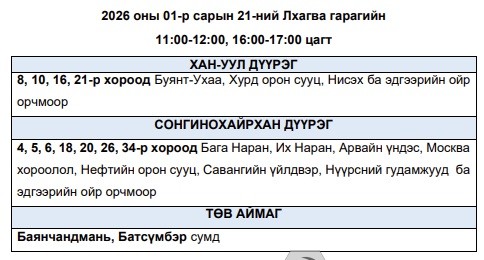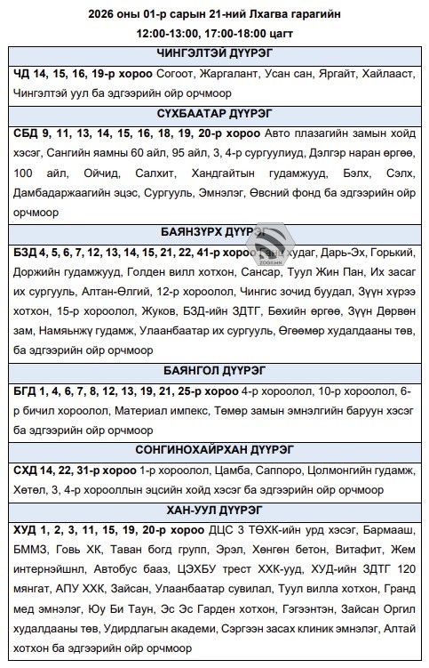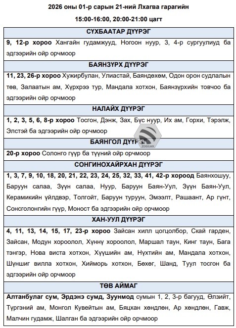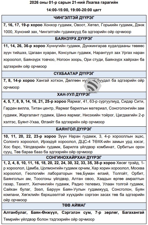 Эрчим хүчний чадлын дутагдлаас шалтгаалан 2026 оны 01-р сарын 21-ний лхагва гарагт цахилгаан эрчим хүчний “ХЯЗГААРЛАЛТ ХИЙЖ БОЛЗОШГҮЙ” байршлуудын хуваарийг танилцуулж байна.