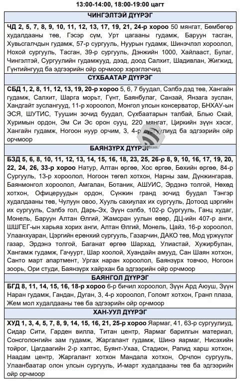 Эрчим хүчний системд аваарын горим үүсэхээс сэргийлэн нийслэлийн хэмжээнд тодорхой байршлуудад цахилгаан эрчим хүчний төлөвлөсөн хэрэглээг “Диспетчерийн үндэсний төв” ТӨХХК-ийн шийдвэрээр хуваарийн дагуу 1-ээс 1 цаг 30 минутын хугацаатайгаар хязгаарлах арга хэмжээ авч байна.