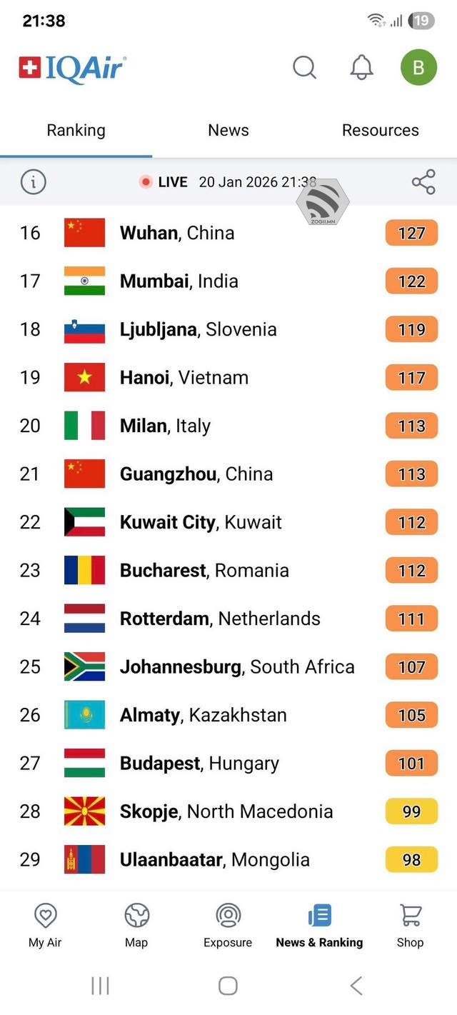 Улаанбаатар хот 2026.01.20-ны байдлаар дэлхийн агаарын бохирдолтой хотуудын 29 дүгээрт эрэмбэлэгдэж байна.