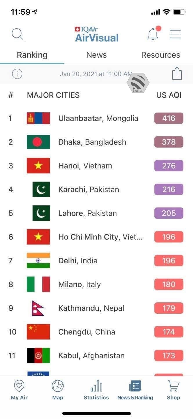 2021 оны энэ өдрийн 11.00 цагт тус жагсаалтын нэгдүгээрт бичигдэж байв гэж Агаарын бохирдлыг бууруулах үндэсний хорооноос мэдээллээ.