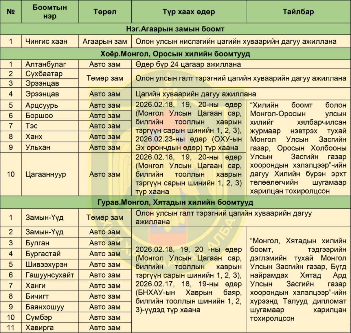 Хилийн боомтуудын 2026 оны 02 дугаар сард ажиллах цагийн хуваарийг танилцуулж байна.