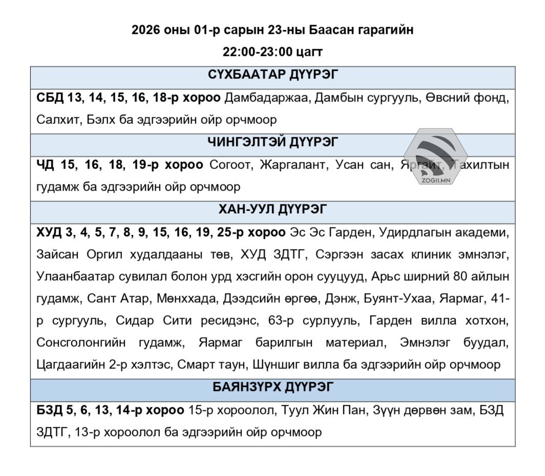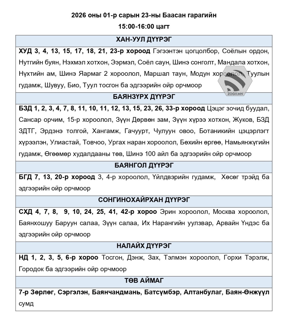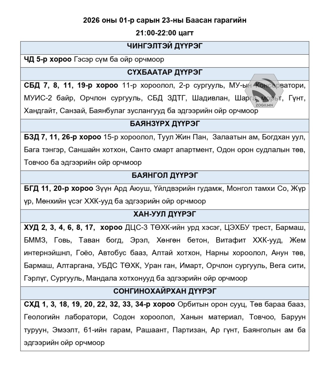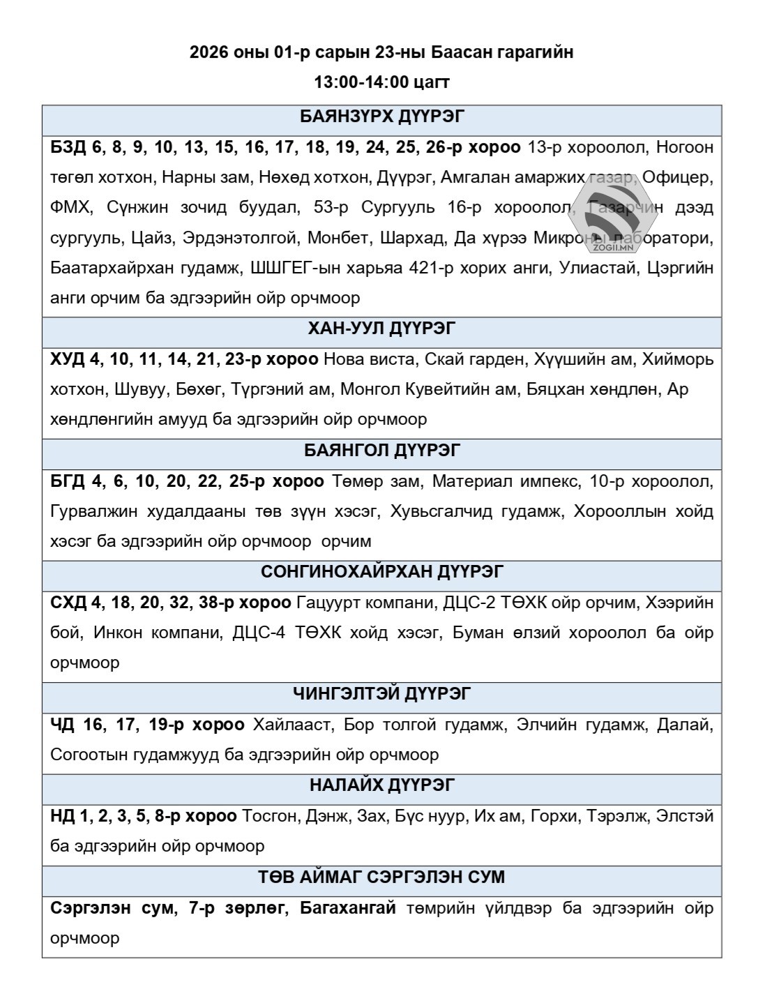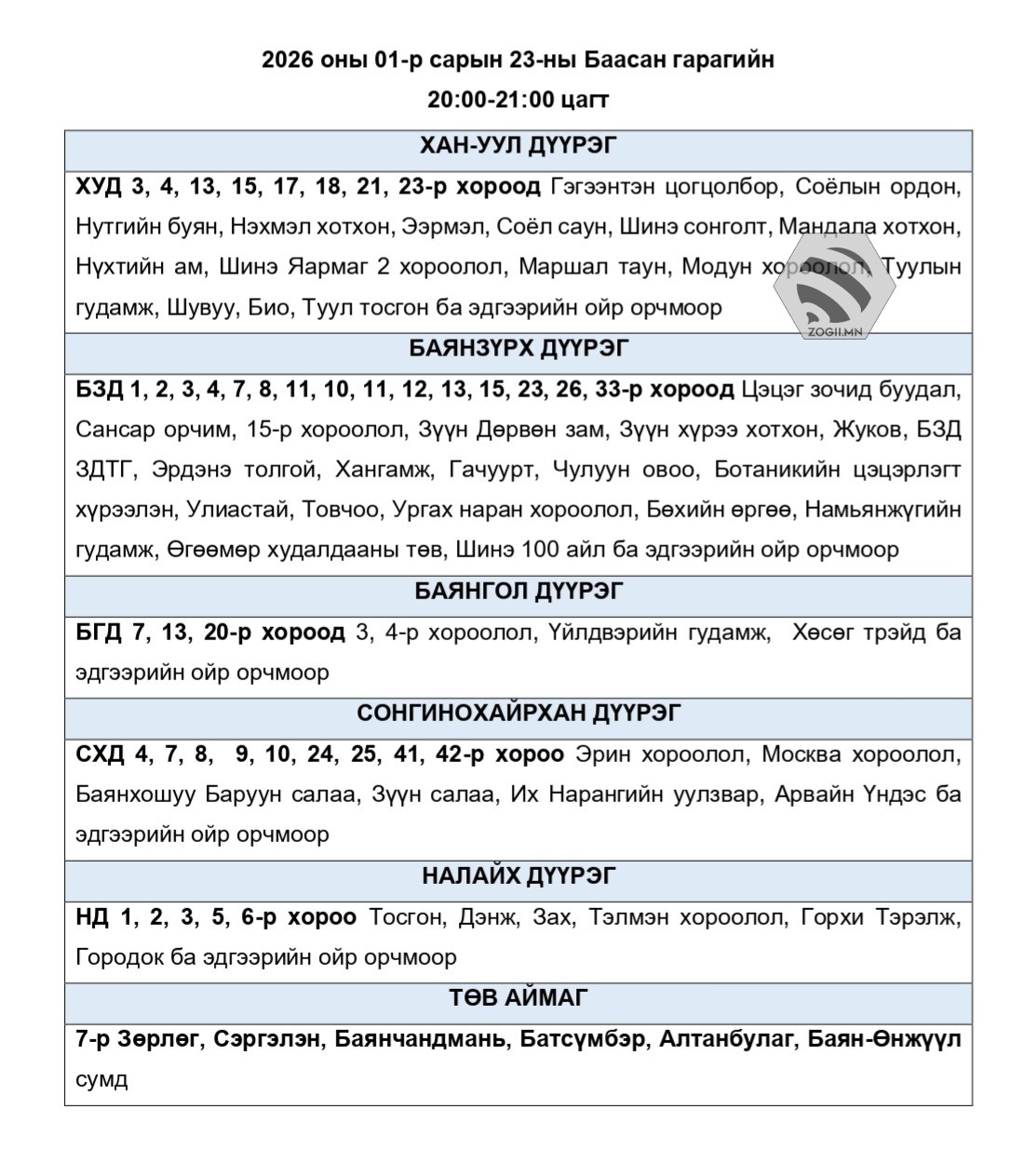 Эрчим хүчний чадлын дутагдлаас шалтгаалан 2026 оны 01-р сарын 23-ны Баасан гарагт цахилгаан эрчим хүчний “ХЯЗГААРЛАЛТ ХИЙЖ БОЛЗОШГҮЙ” байршлуудын хуваарийг танилцуулж байна.