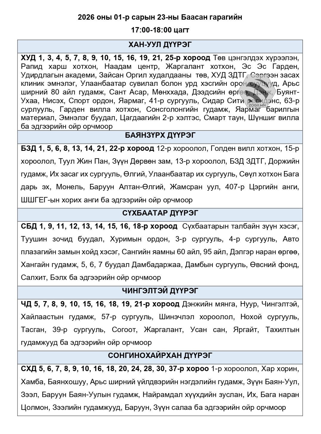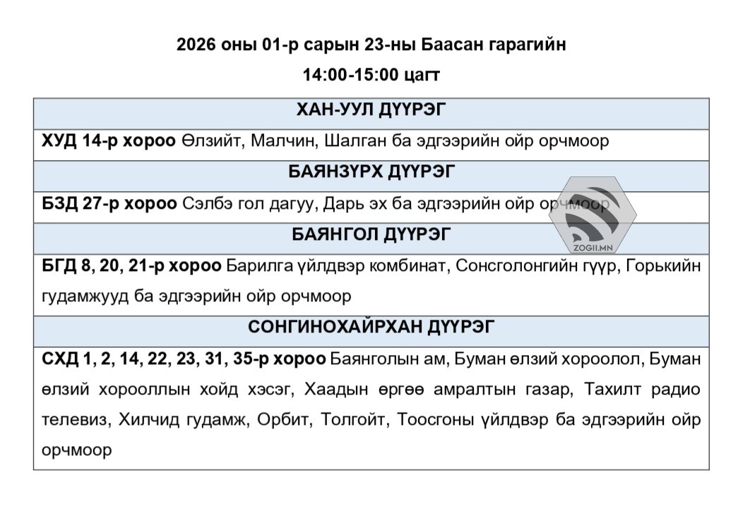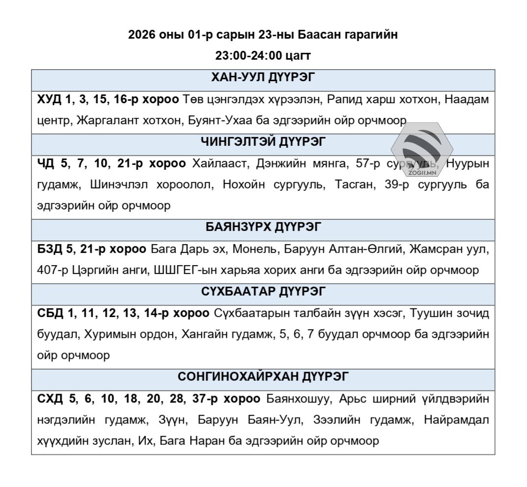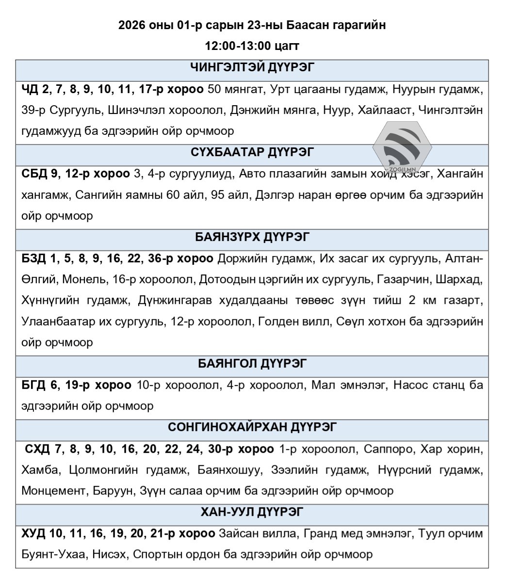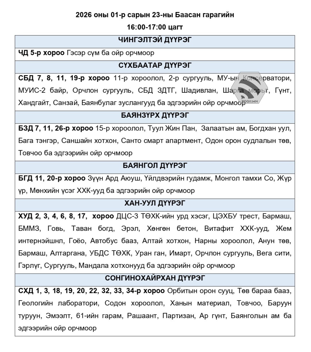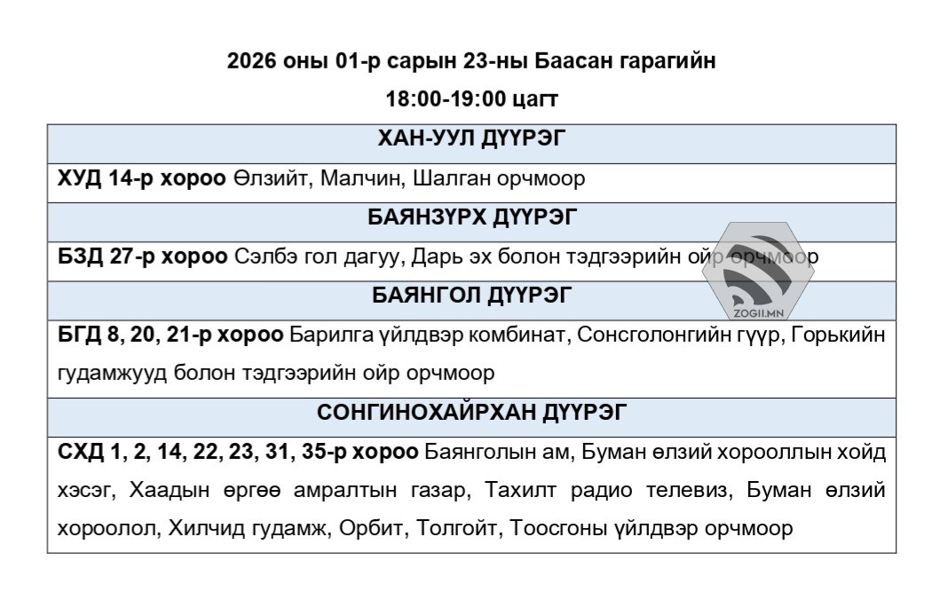 Эрчим хүчний чадлын дутагдлаас шалтгаалан 2026 оны 01-р сарын 23-ны Баасан гарагт цахилгаан эрчим хүчний “ХЯЗГААРЛАЛТ ХИЙЖ БОЛЗОШГҮЙ” байршлуудын хуваарийг танилцуулж байна.