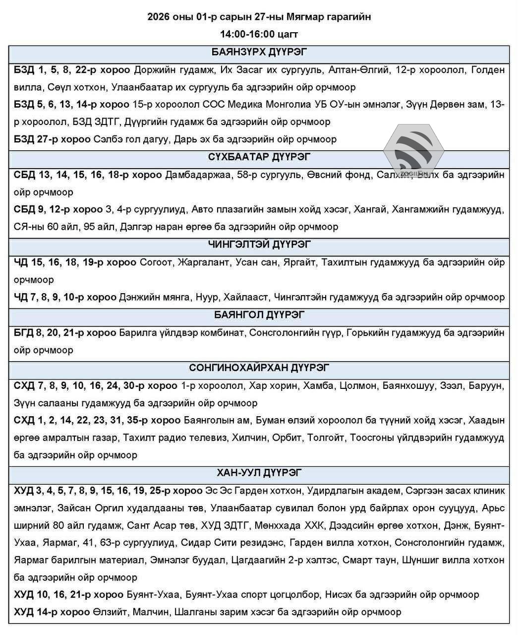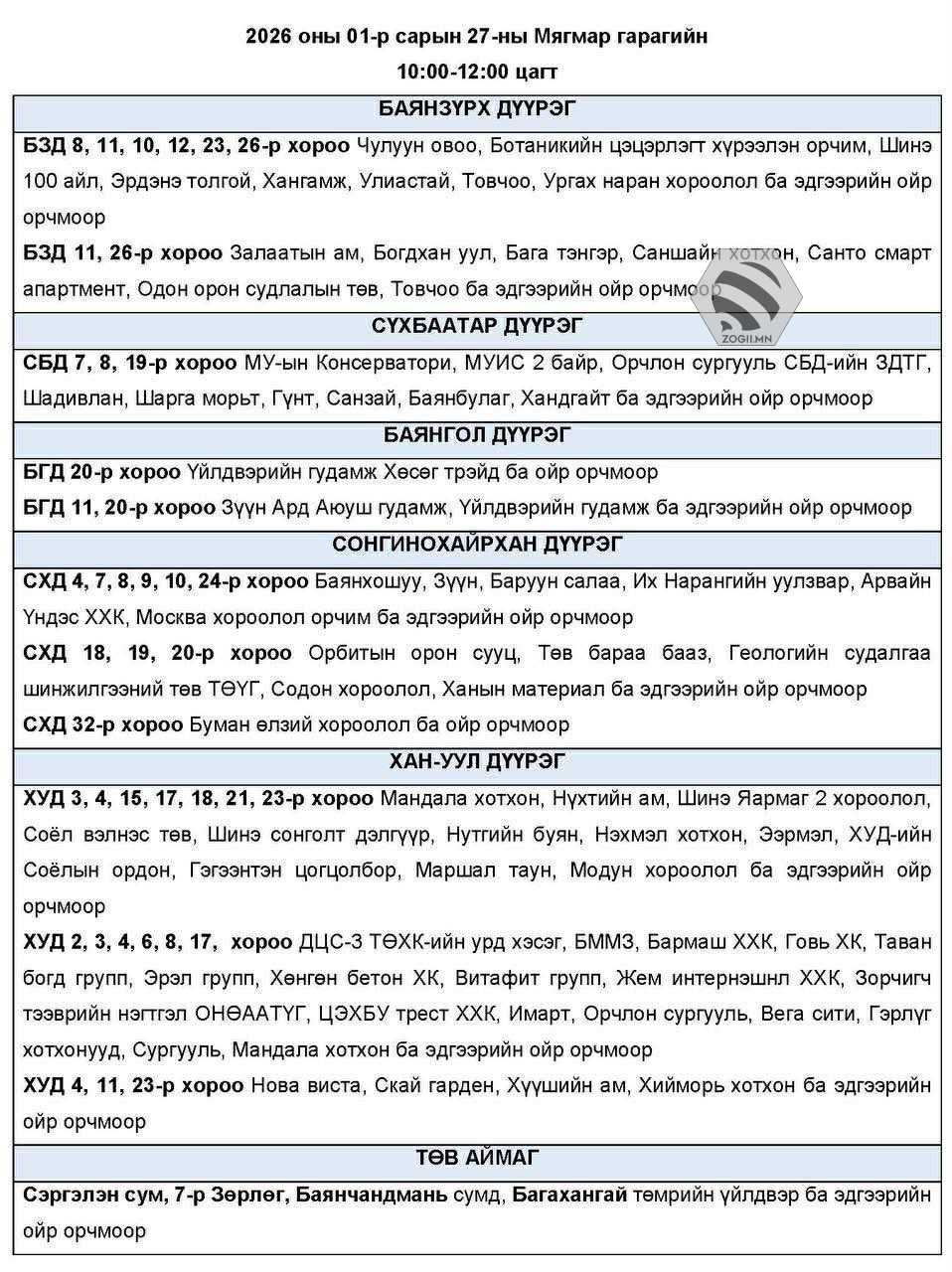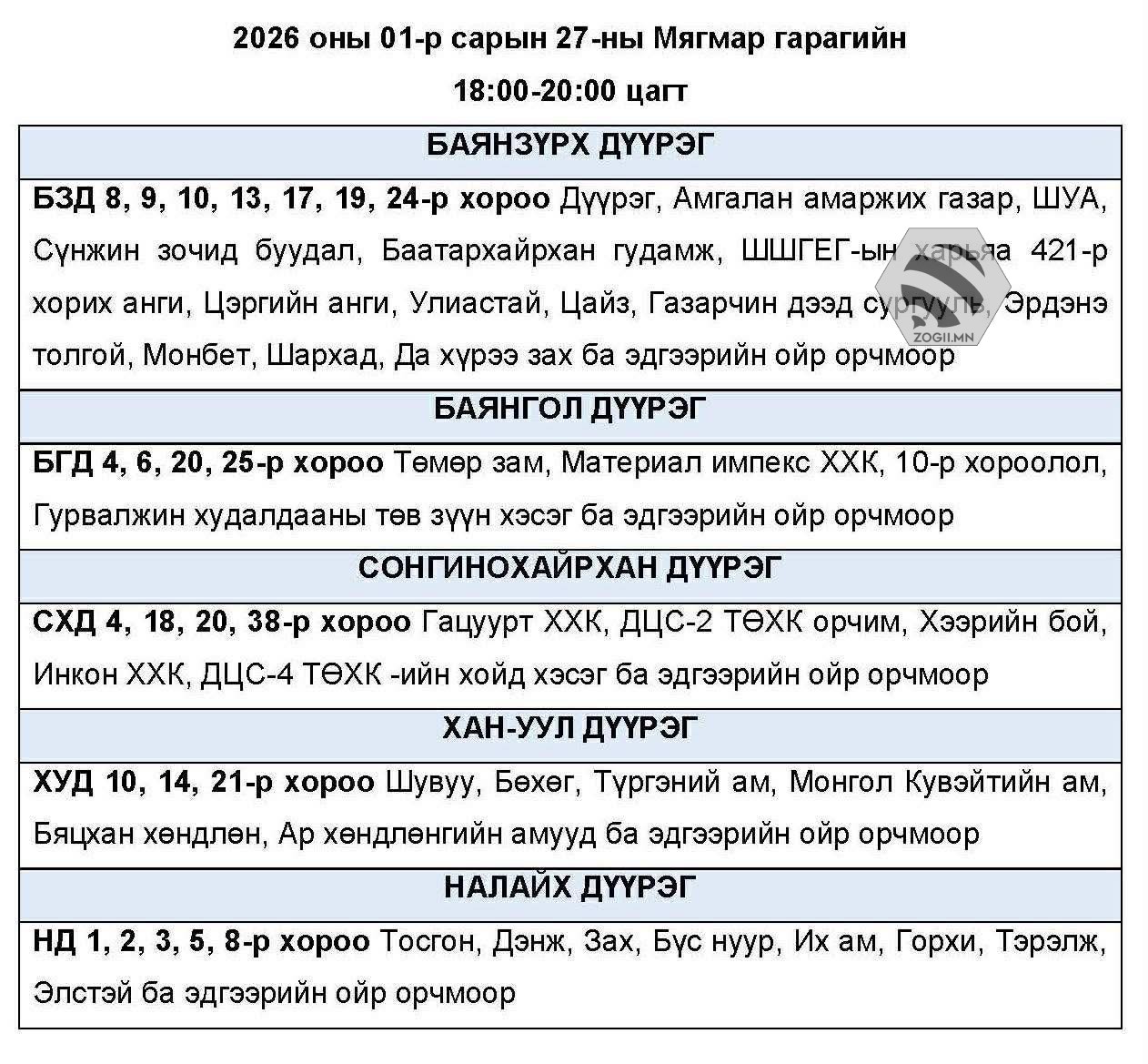 2026 оны нэгдүгээр сарын 27-нд зарим байршилд цахилгаан эрчим хүчийг 2 цагийн хугацаатай хязгаарлана