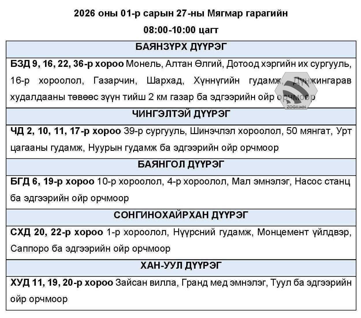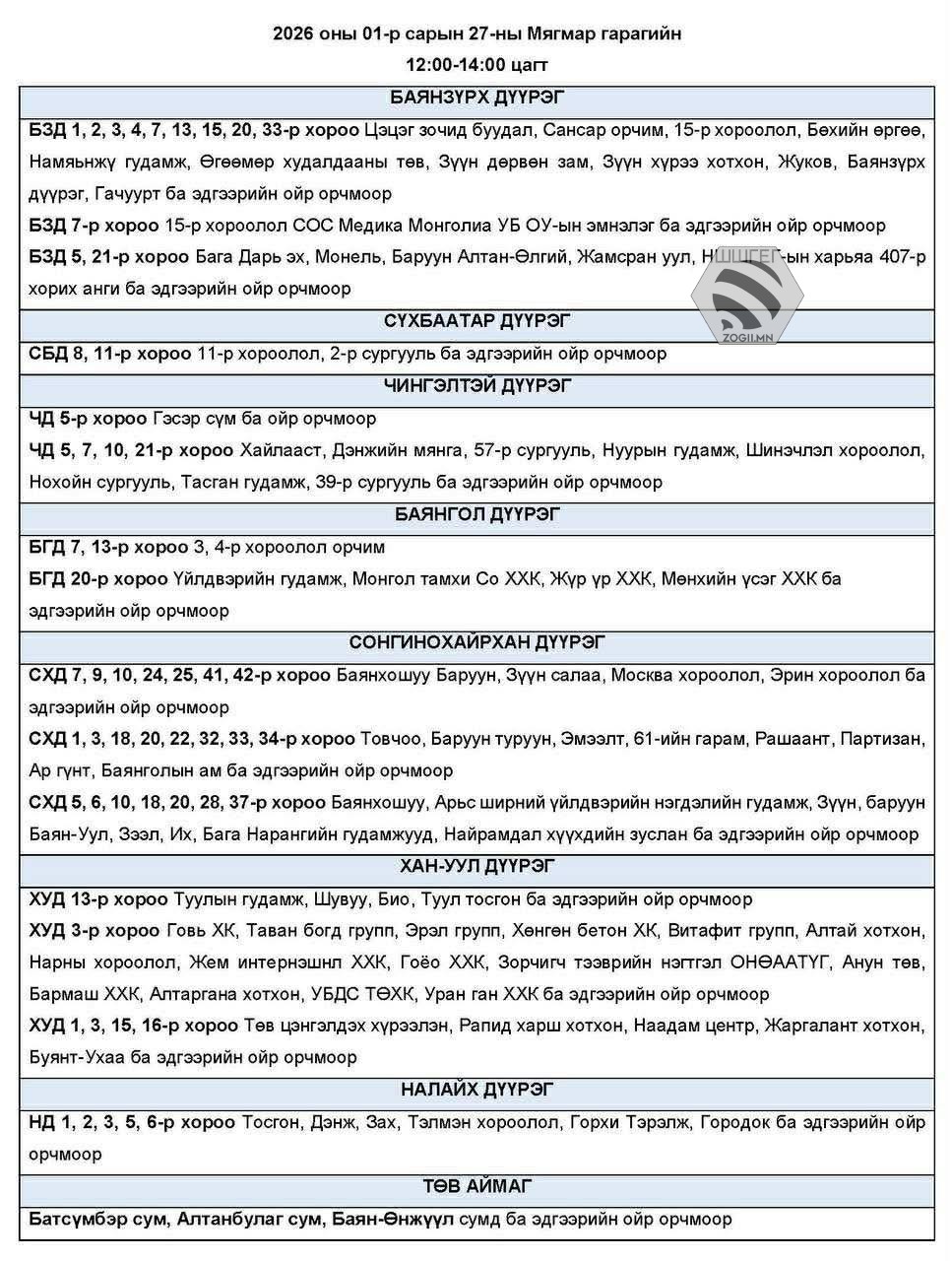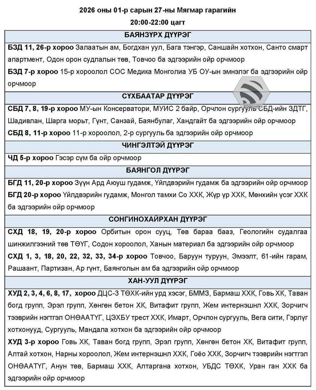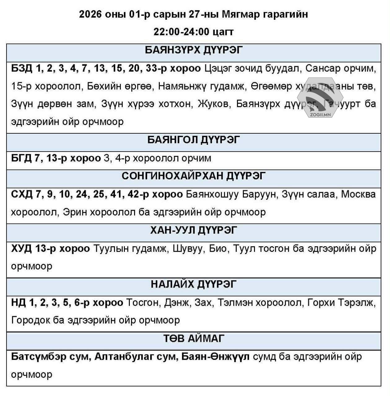 2026 оны нэгдүгээр сарын 27-нд зарим байршилд цахилгаан эрчим хүчийг 2 цагийн хугацаатай хязгаарлана