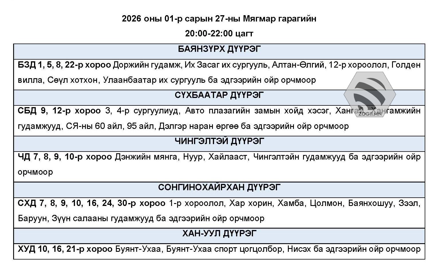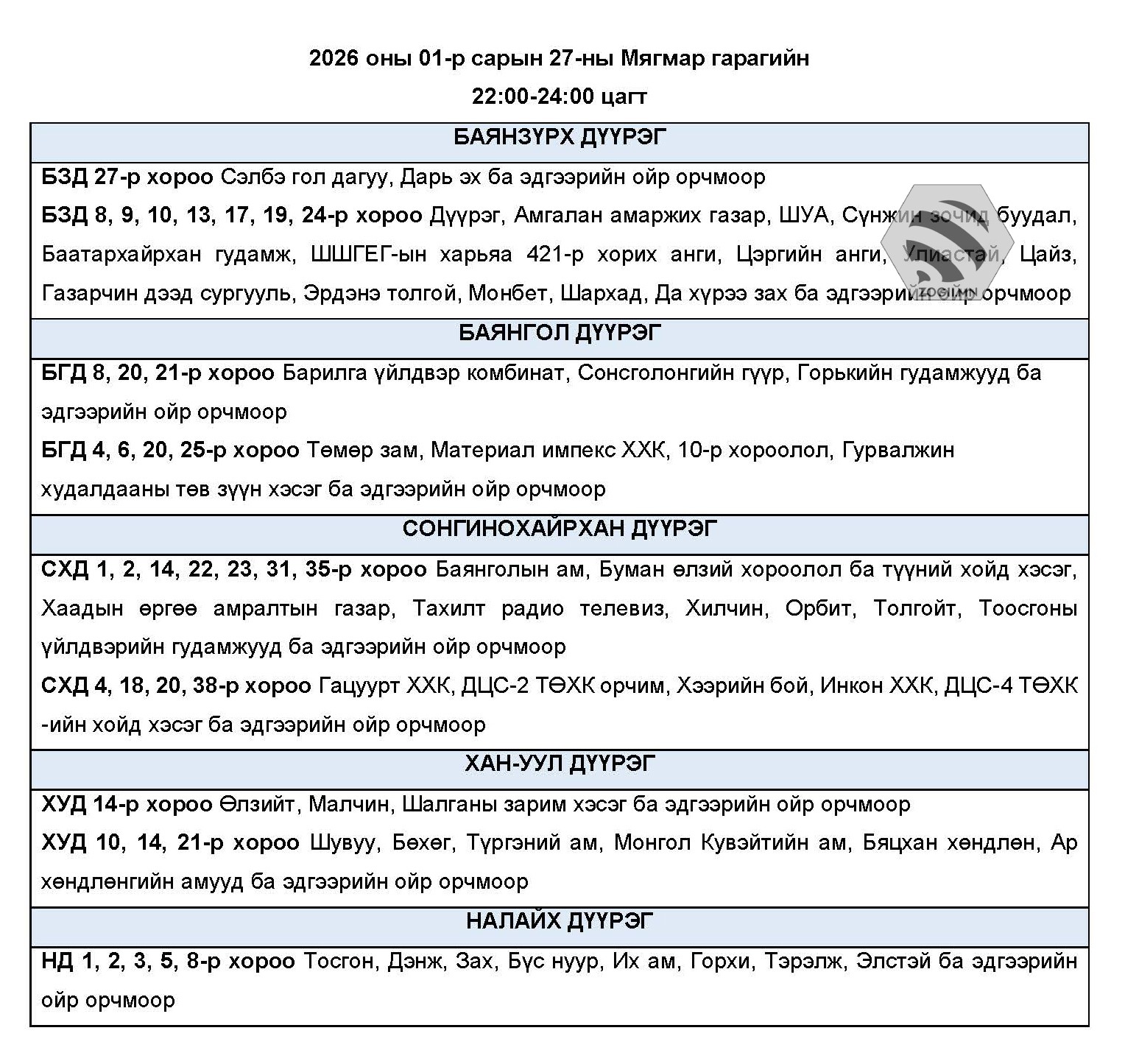 Бөхөлжүүтийн цахилгаан станц өнөөдөр бүрэн хүчин чадлаараа ажиллах боломжгүй байгаатай холбогдуулан өнөөдрийн эрчим хүчний хязгаарлалтын хуваарьт зарим байршлууд нэмэгдэж болзошгүй байгаа талаар мэдэгдлээ.