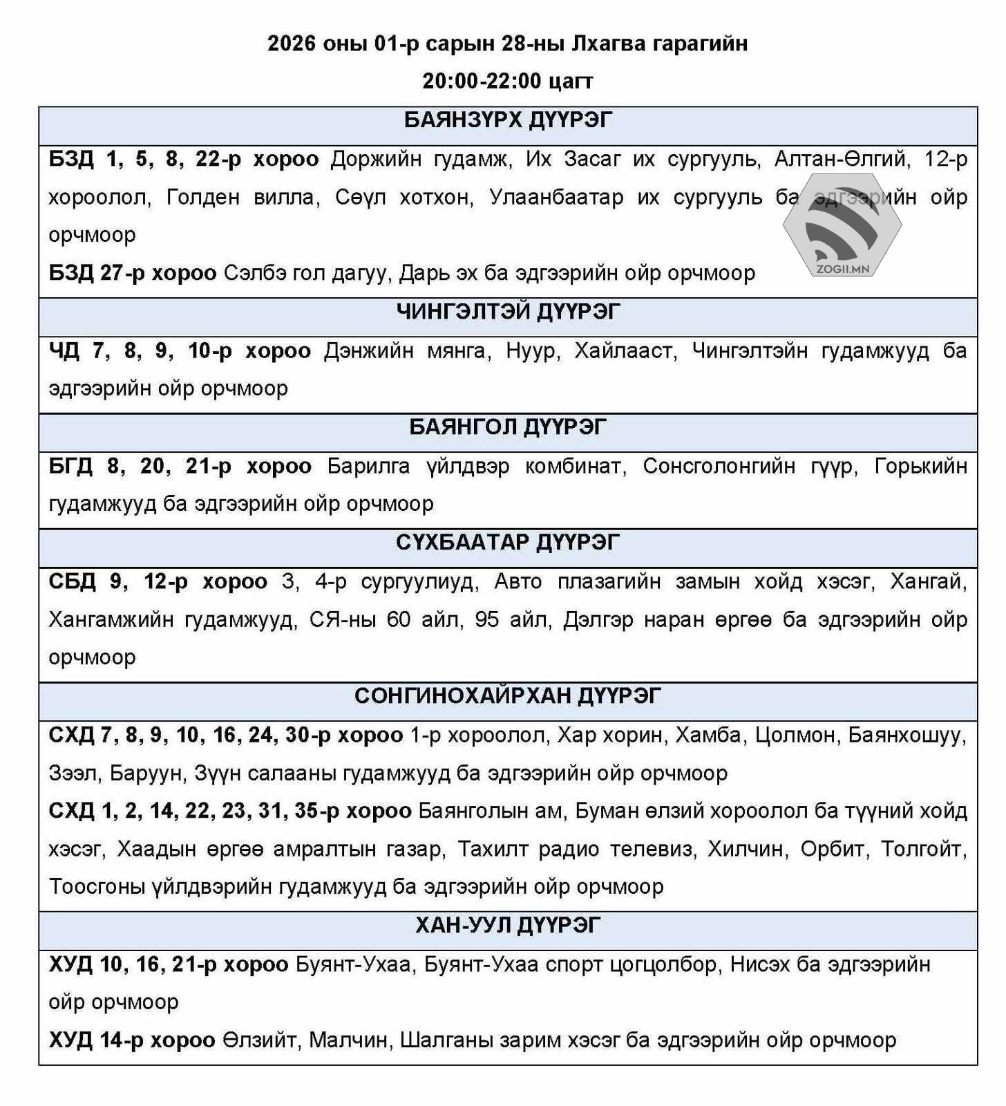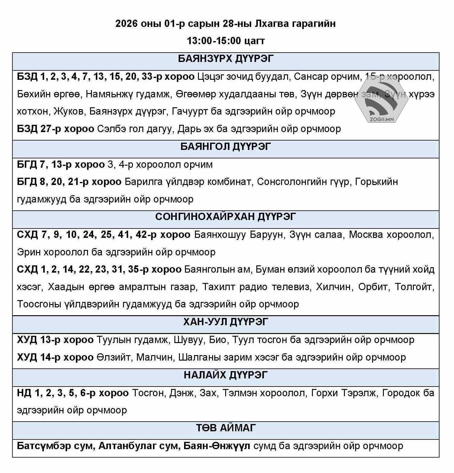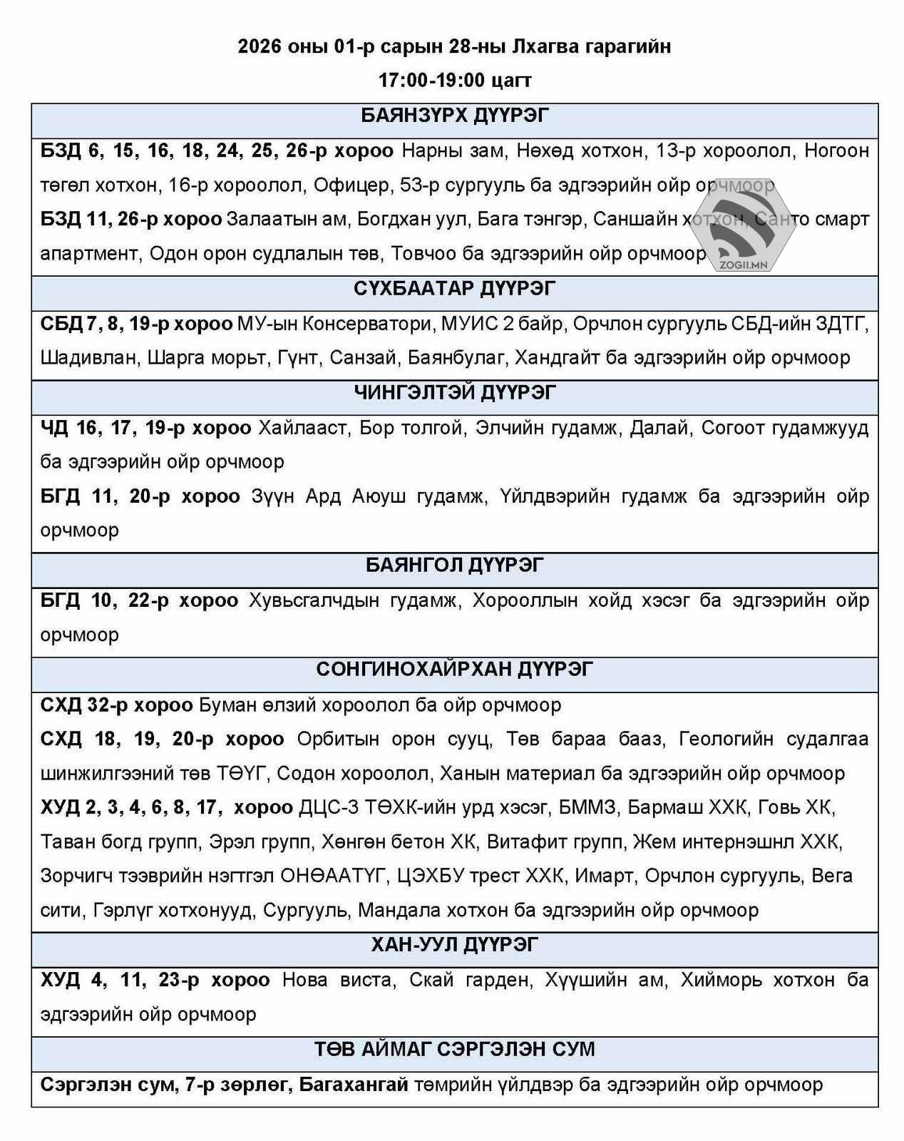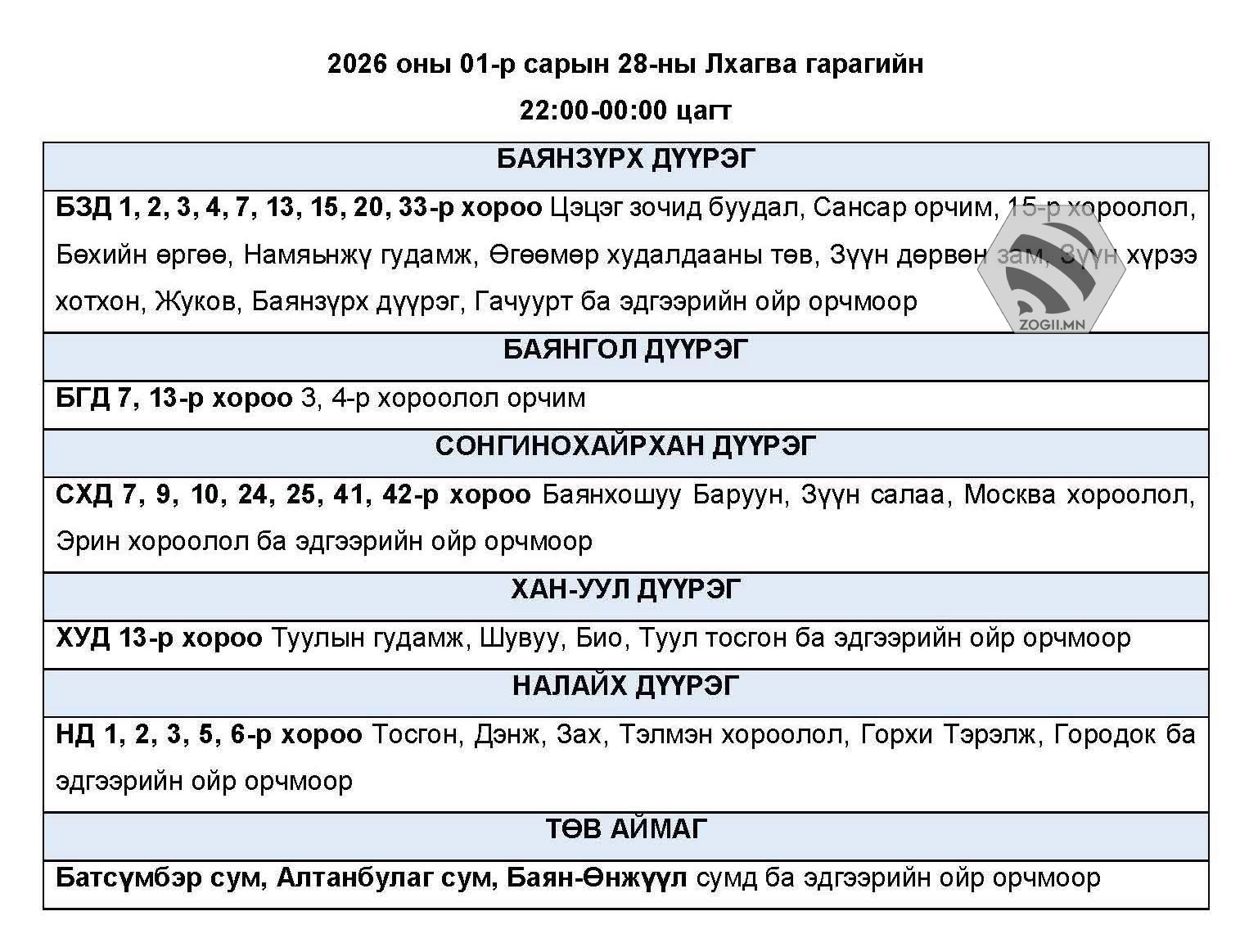 2026 оны 01 дүгээр сарын 28-ны Лхагва гарагт эрчим хүчний нэгдсэн сүлжээнд аваарын горим үүсэхээс урьдчилан сэргийлэх зорилгоор тодорхой байршлуудад цахилгаан эрчим хүчний хэрэглээг түр хугацаанд хязгаарлахаар болжээ.