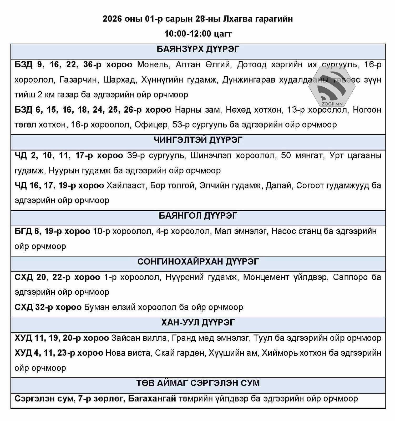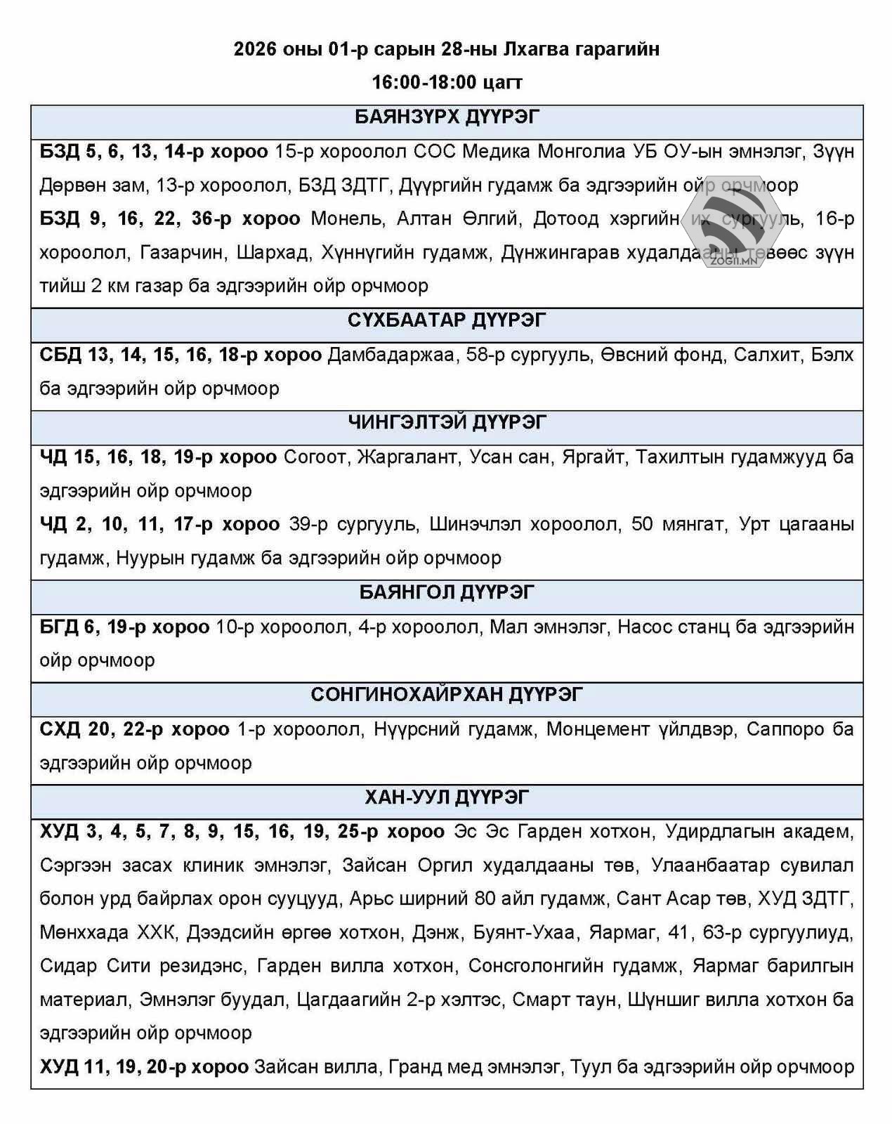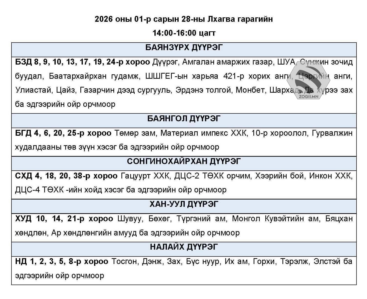 2026 оны 01 дүгээр сарын 28-ны Лхагва гарагт эрчим хүчний нэгдсэн сүлжээнд аваарын горим үүсэхээс урьдчилан сэргийлэх зорилгоор тодорхой байршлуудад цахилгаан эрчим хүчний хэрэглээг түр хугацаанд хязгаарлахаар болжээ.