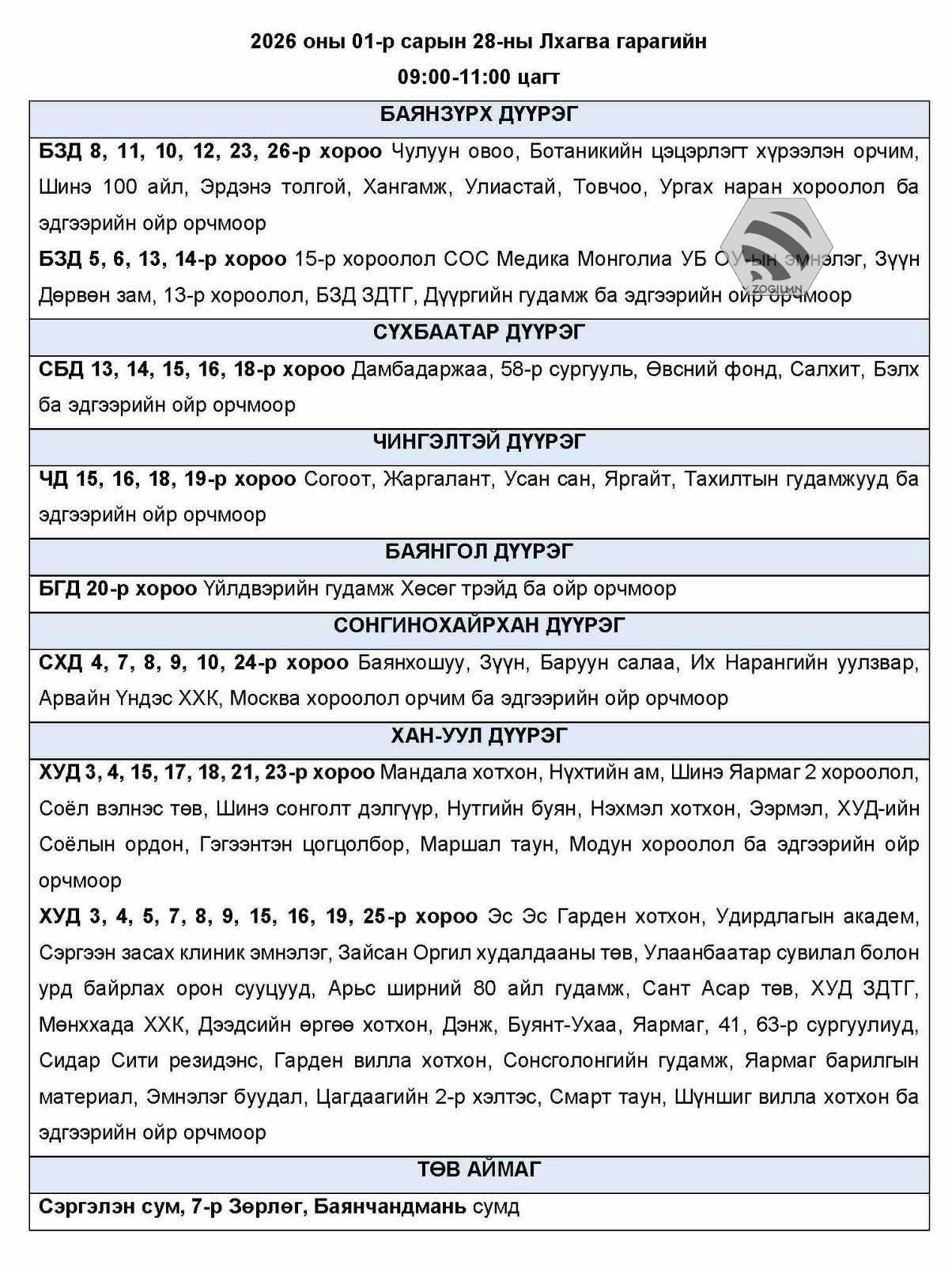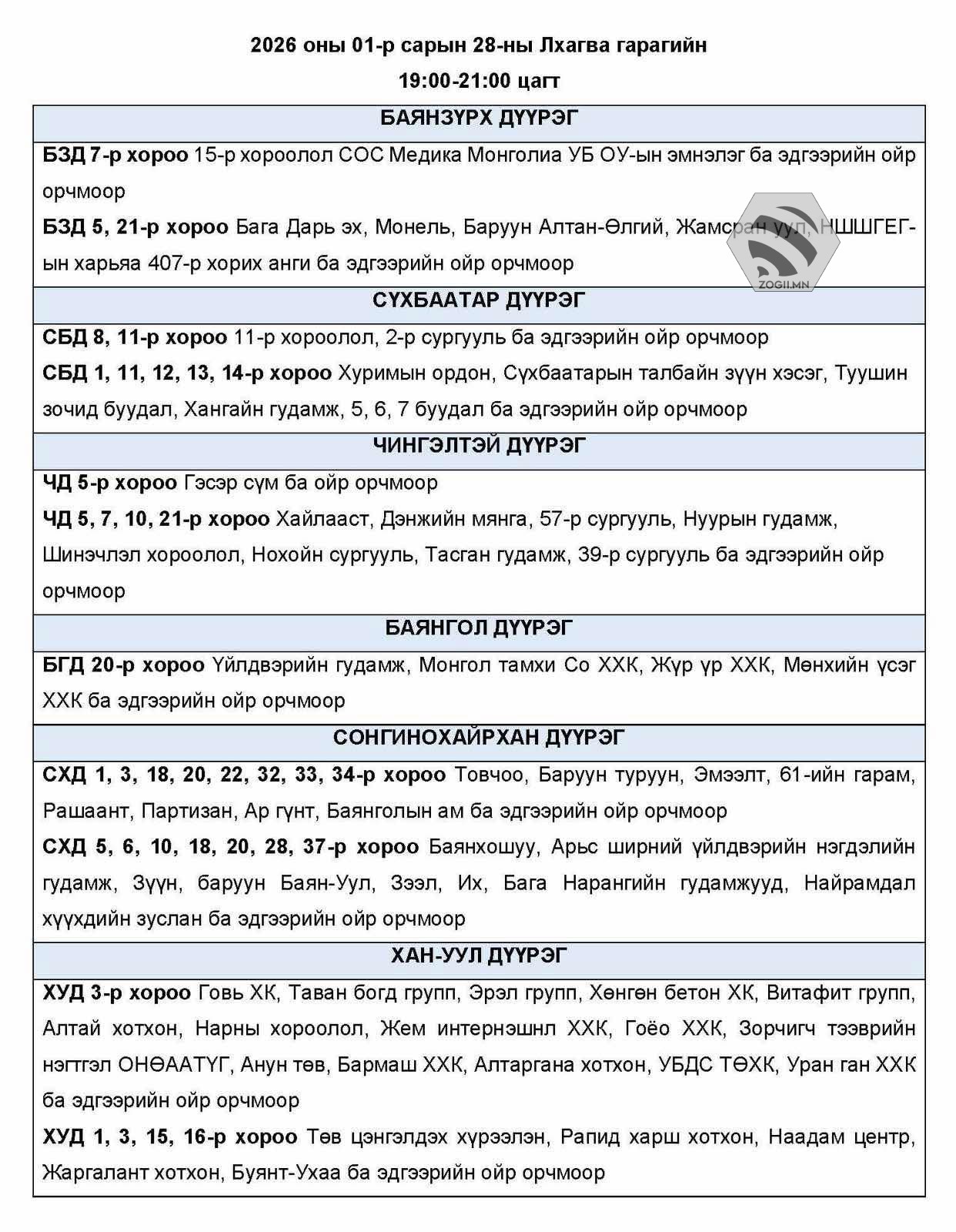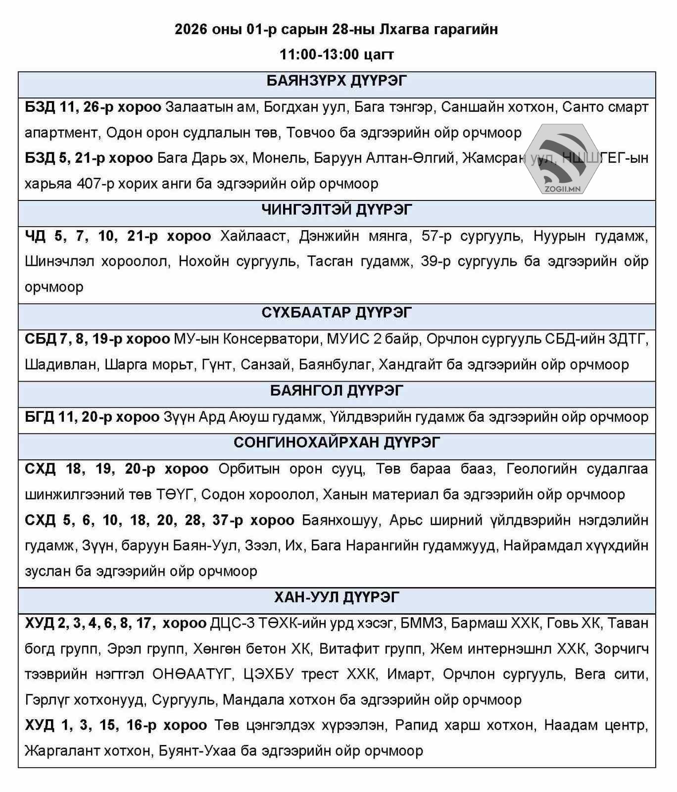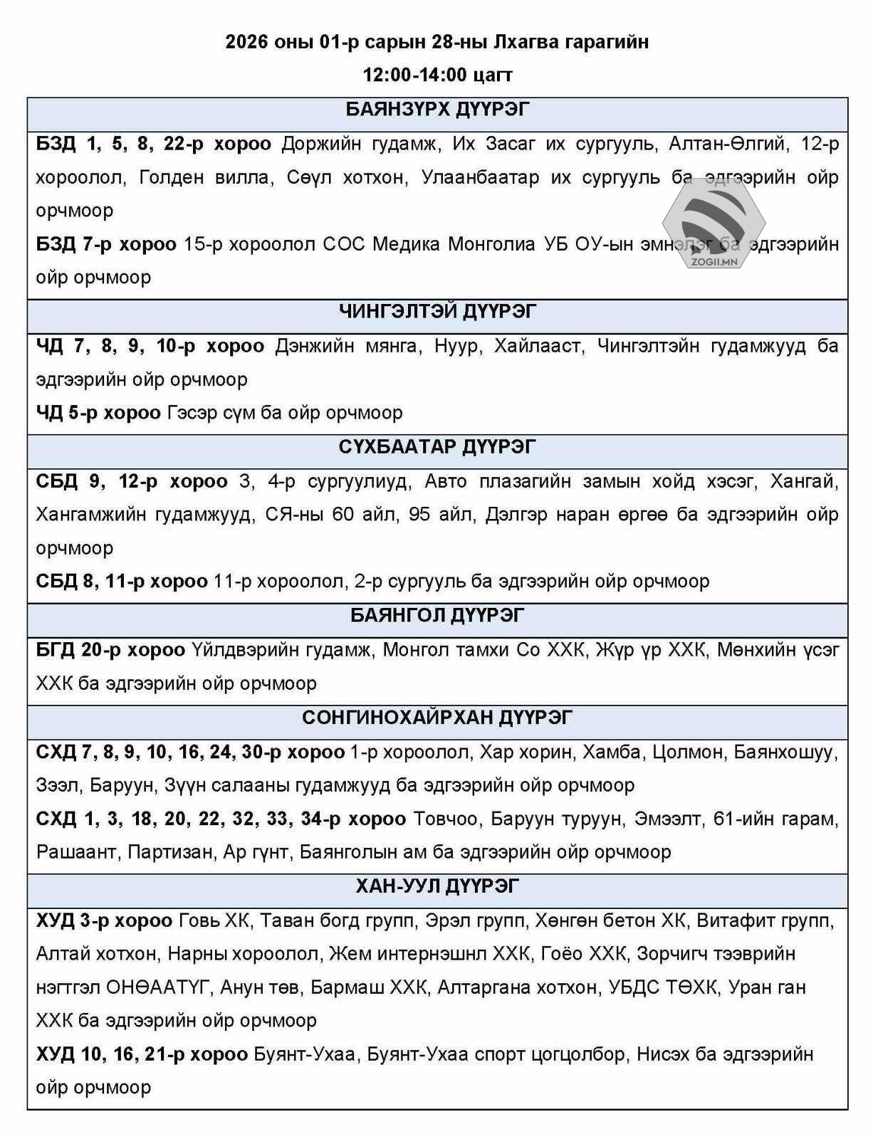 2026 оны 01 дүгээр сарын 28-ны Лхагва гарагт эрчим хүчний нэгдсэн сүлжээнд аваарын горим үүсэхээс урьдчилан сэргийлэх зорилгоор тодорхой байршлуудад цахилгаан эрчим хүчний хэрэглээг түр хугацаанд хязгаарлахаар болжээ.