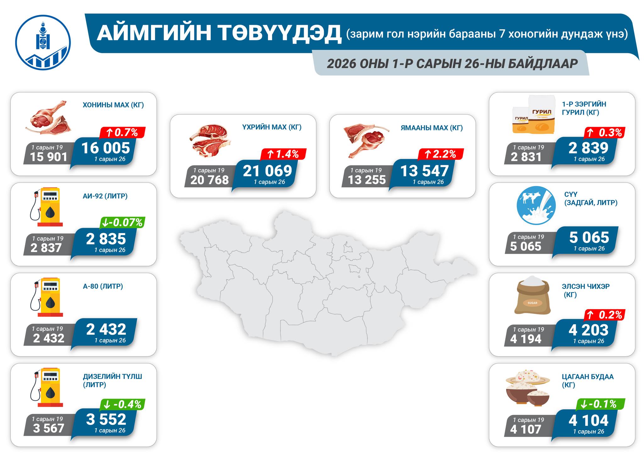 2026 оны 1 дүгээр сарын 26-ны байдлаар аймгийн төвүүдэд зарагдаж байгаа гол нэрийн зарим хүнсний барааны дундаж үнийг танилцуулж байна.