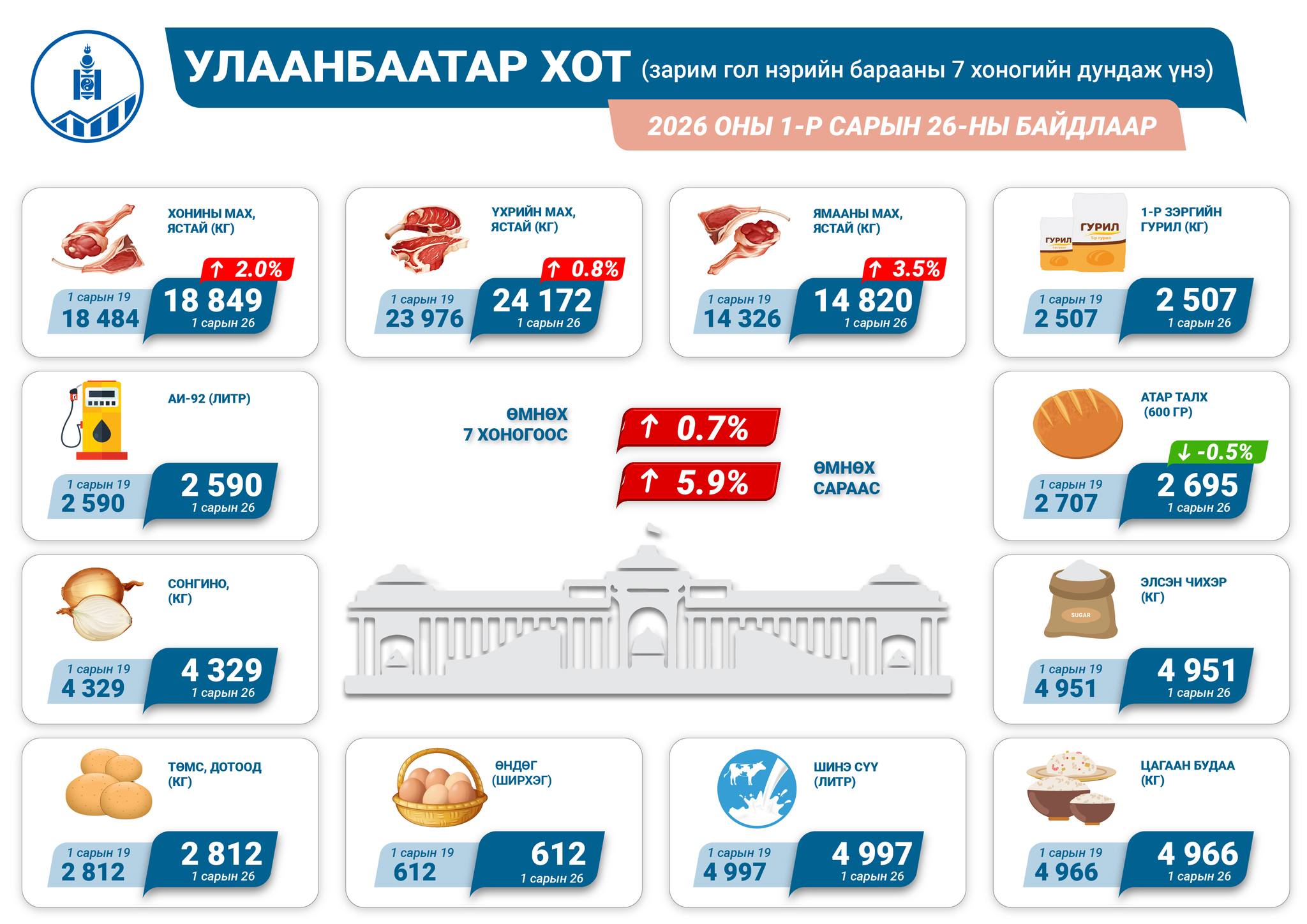 Улаанбаатар хотод 2026 оны 1 дүгээр сарын 26-ны байдлаар гол нэрийн зарим барааны үнэ өмнөх сараас 5.9 хувь, өмнөх 7 хоногоос 0.7 хувиар тус тус нэмэгдсэн байна.