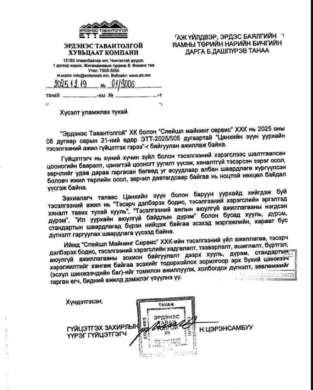 Ямартай ч “Эрдэнэс Таван Толгой” ХК-оос холбогдох гомдол, хүсэлтийг АҮЭБЯ-нд хүргүүлээд байгаа энэ үед мэргэжлийн яам хуульд нийцсэн, хараат бус дүгнэлт гаргаж, хариуцлага алдсан компанид хуулийн дагуу арга хэмжээ авч чадах эсэхийг харах үлдлээ.