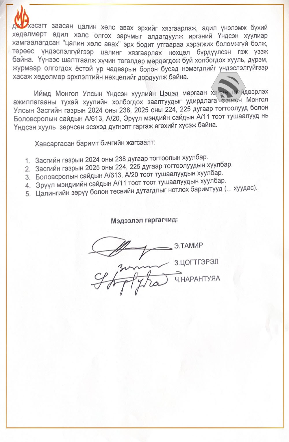 Монголын Үйлдвэрчний эвлэлийн холбооны Ерөнхийлөгч Э.Тамир, Монголын Боловсрол, Шинжлэх Ухааны Үйлдвэрчний Эвлэлийн Холбооны дарга З.Цогтгэрэл, Монголын Эрүүл Мэндийн Ажилтны Үйлдвэрчний Эвлэлийн Холбооны дарга Ч.Нарантуяа нар Монгол Улсын Үндсэн хуулийн цэцэд өнөөдөр /2026.02.05/ мэдээлэл хүлээлгэн өглөө.