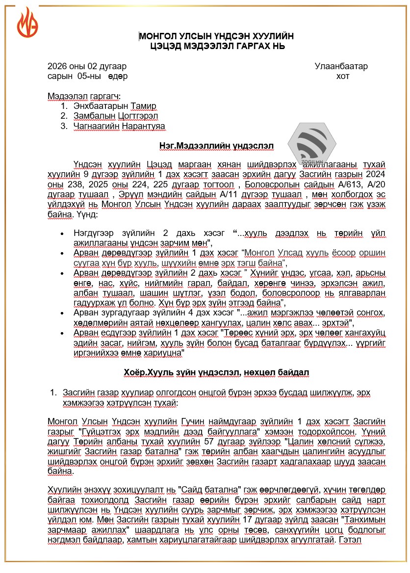 Тус мэдээлэлд Засгийн газрын 2024 оны 238, 2025 оны 224, 225 дугаар тогтоолууд, мөн Боловсролын сайдын А/613, А/20, Эрүүл мэндийн сайдын А/11 тоот тушаалууд нь Монгол Улсын Үндсэн хуулийн холбогдох заалтуудыг зөрчсөн байж болзошгүй талаар үндэслэлтэйгээр дурдсан байна.