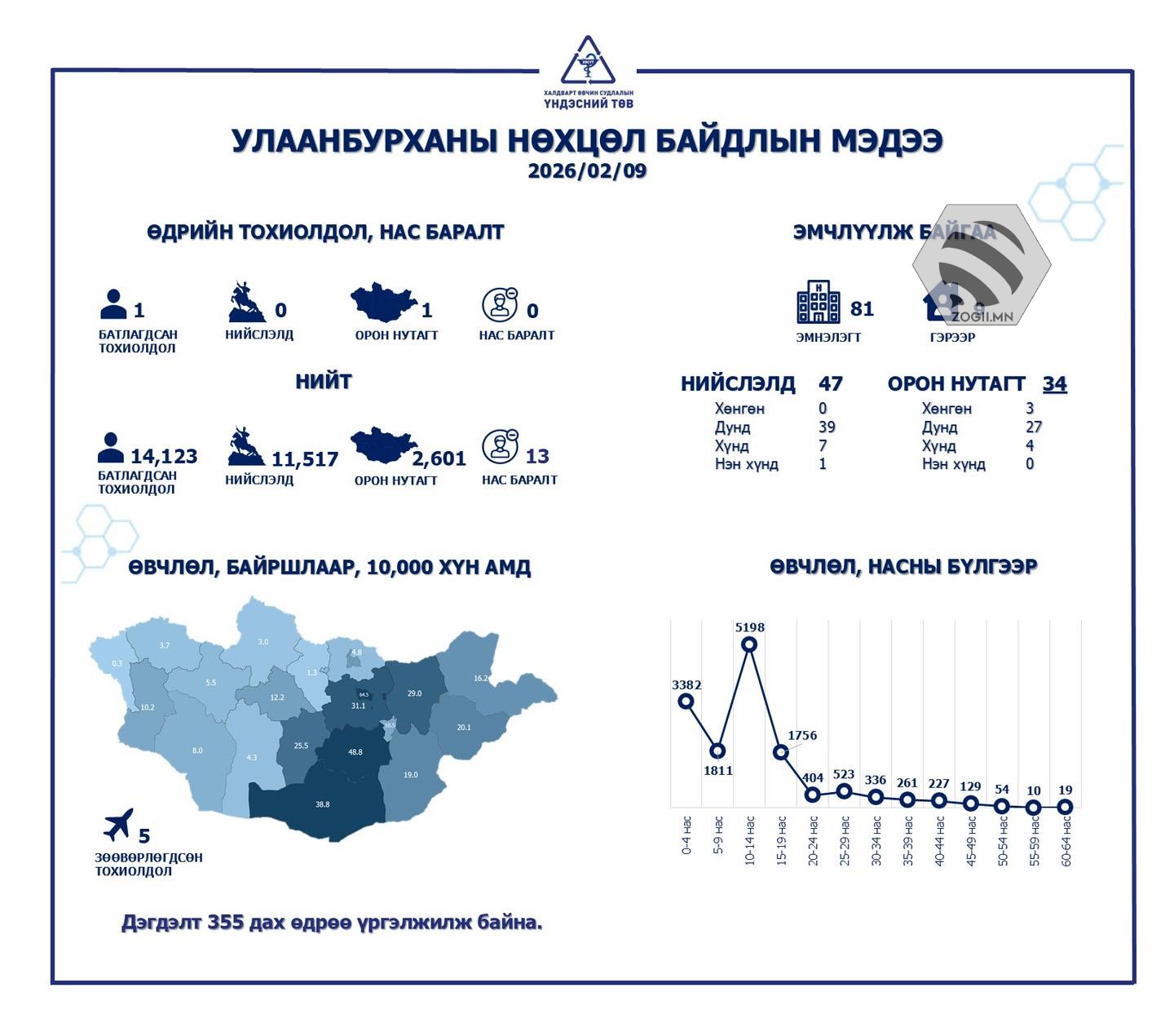 Нийт батлагдсан тохиолдлын 11,517 нь нийслэлд, 2,601 нь орон нутагт бүртгэгдсэн бол уг өвчний улмаас 13 хүн нас барсан байна. Өдрийн шинээр илэрсэн тохиолдол нэгээр нэмэгдэж, орон нутагт бүртгэгджээ. Нас баралт шинээр бүртгэгдээгүй байна.