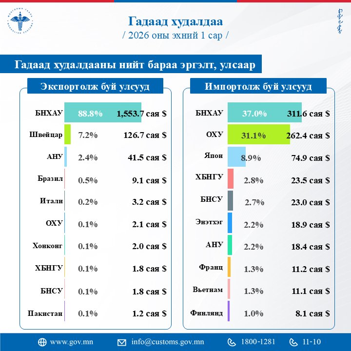Тухайлбл 2026 оны 1-р сарын гүйцэтгэлээр гадаад худалдааны нийт бараа эргэлт 2.59 тэрбум ам.доллар хүрч өнгөрсөн оны мөн үеэс 30.1%-иар өсчээ. Экспортын дүн импортын дүнгээс 906.5 сая ам.доллараар давж, гадаад худалдааны баланс эерэг гарлаа.