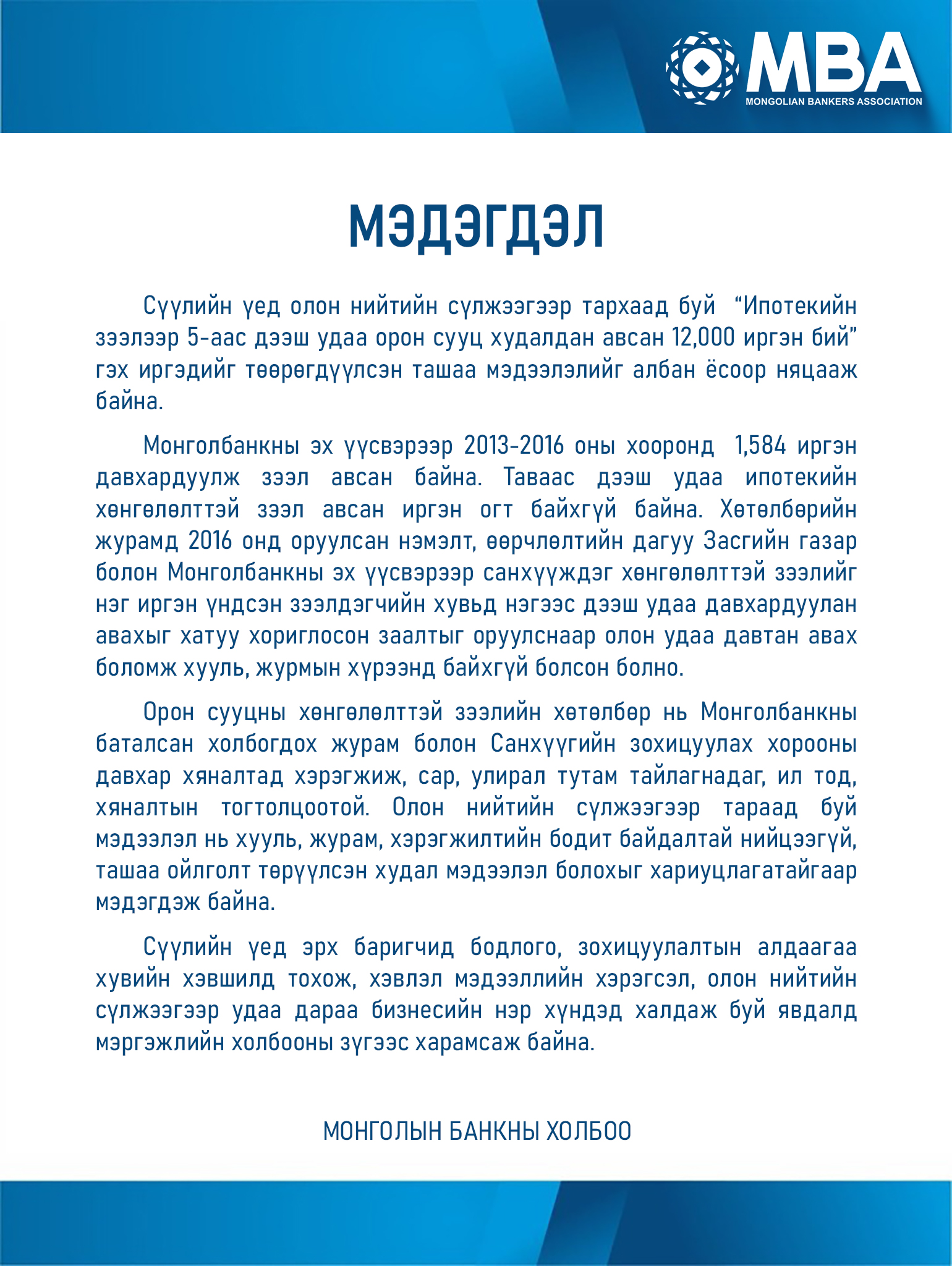 "Ипотекийн зээлээр 5-аас дээш удаа орон сууц худалдан авсан 12,000 иргэн бий" гэдэг нь худал хэмээн Монголын банкны холбооноос мэдэгдэв.