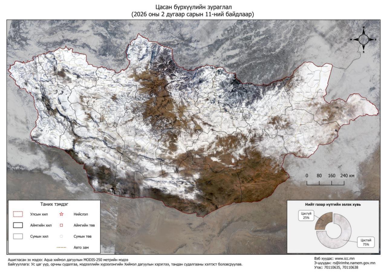 Монгол орны нийт нутгийн 75 хувь нь цасан бүрхүүлтэй байна.