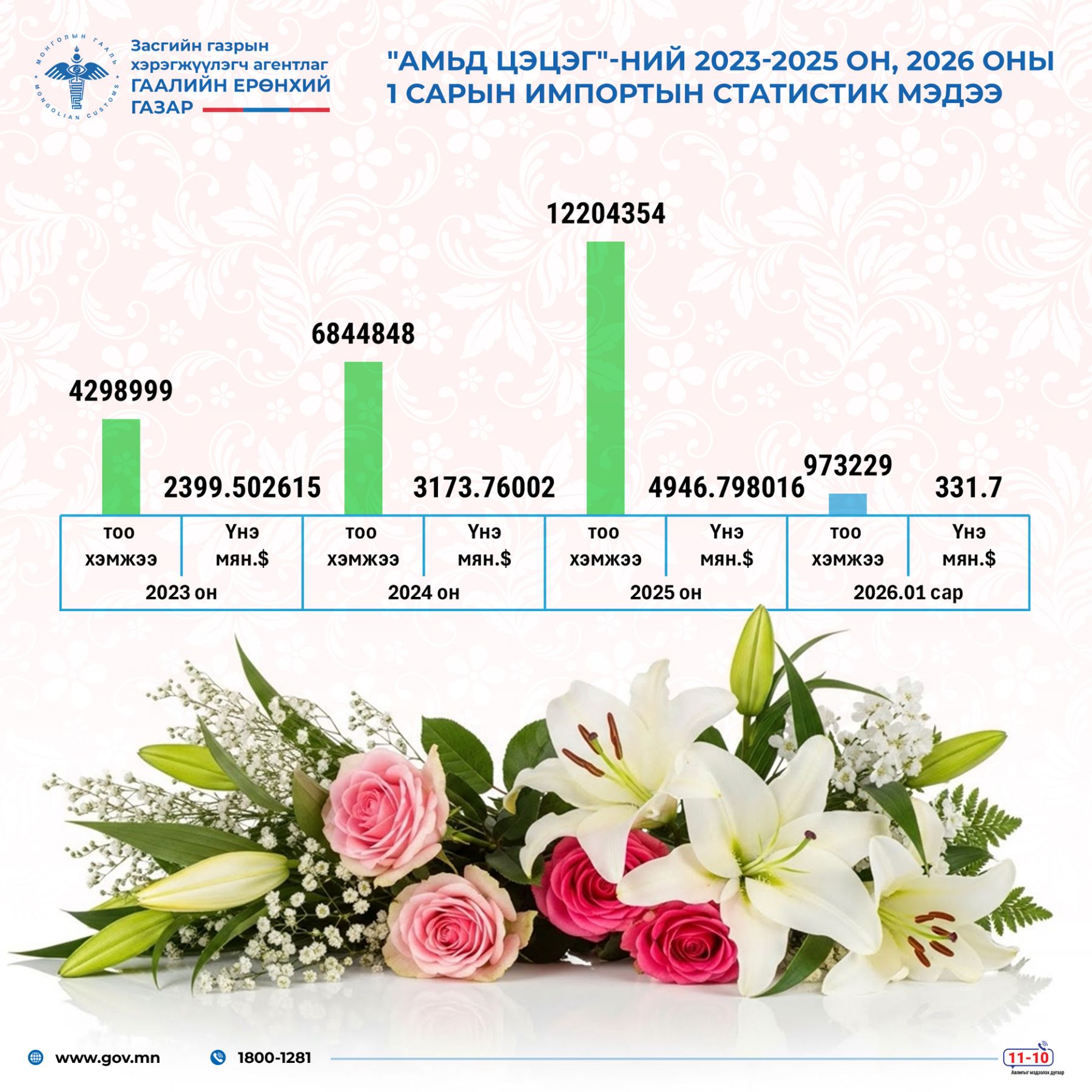 2026 оны эхний 1 сард 973,229 ширхэг амьд цэцэг импортолжээ. Харин өмнөх жилүүдийн тоо баримтыг харвал амьд цэцгийн импорт сүүлийн 3 жилийн дотор 2.9 дахин өссөн байна.