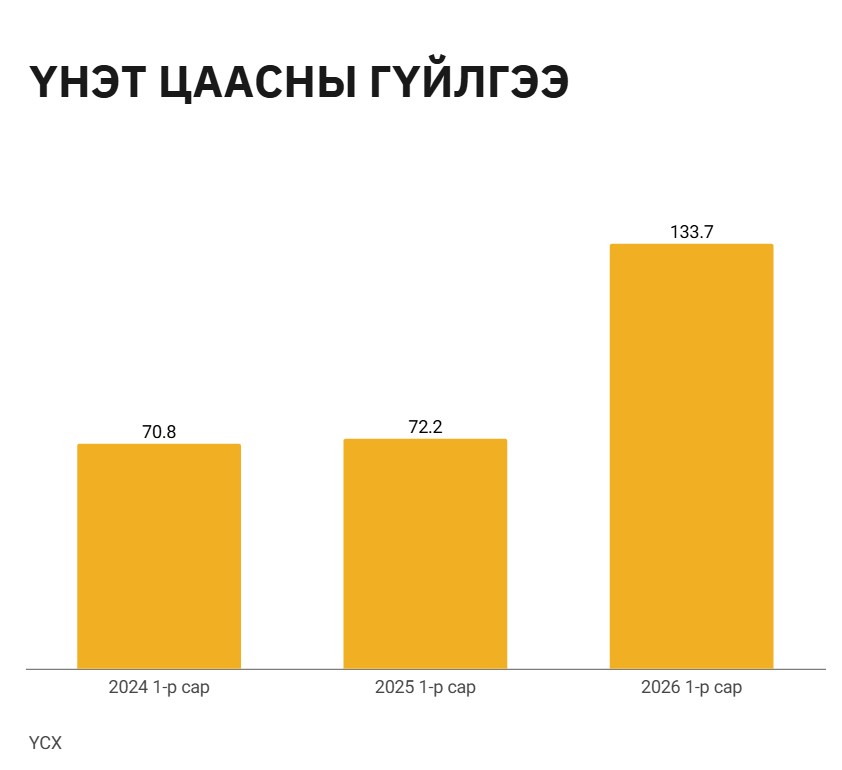 Үнэт цаасны зах зээлийн арилжаагаар 2026 оны 1 дүгээр сард 133.7 тэрбум төгрөгийн гүйлгээ хийж, өмнөх оны мөн үеэс 61.5 (85.2%) тэрбум төгрөгөөр өсжээ.