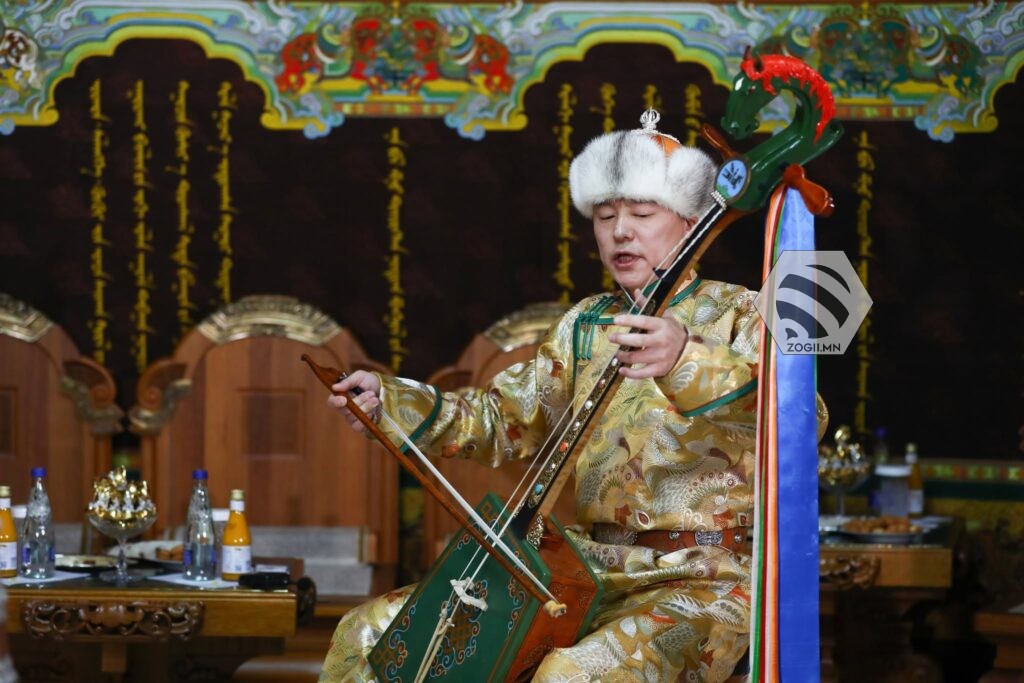 Төрийн золголтын дараа Соёлын тэргүүний ажилтан, ерөөлч, магтаалч, морин хуурч Ц.Соёл-Эрдэнэ Төрийн хан хуурын хөгийг тэгшиллээ.