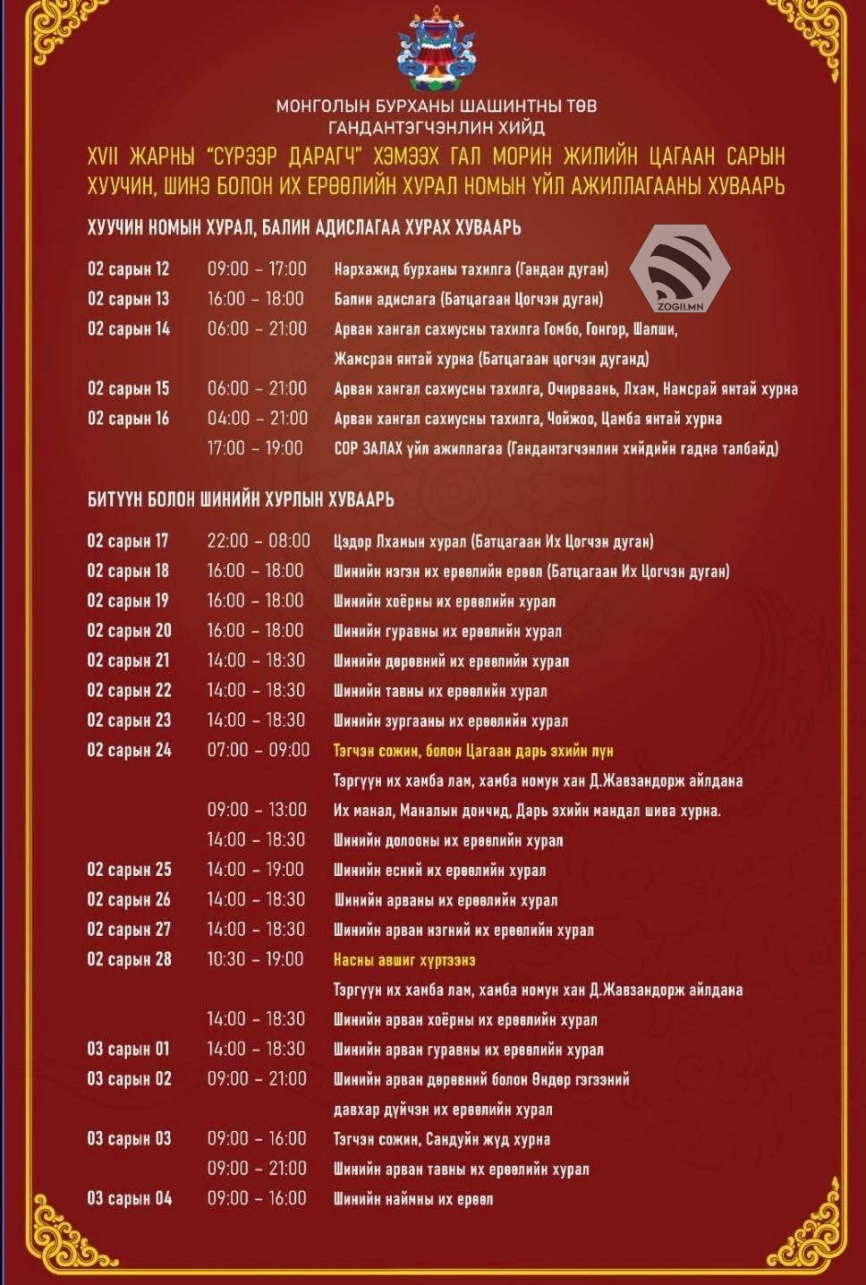 XVII жарны “Сүрээр дарагч” хэмээх гал морин жилийн цагаан сарын их ерөөлийн хурал номын үйл ажиллагааны хуваарь