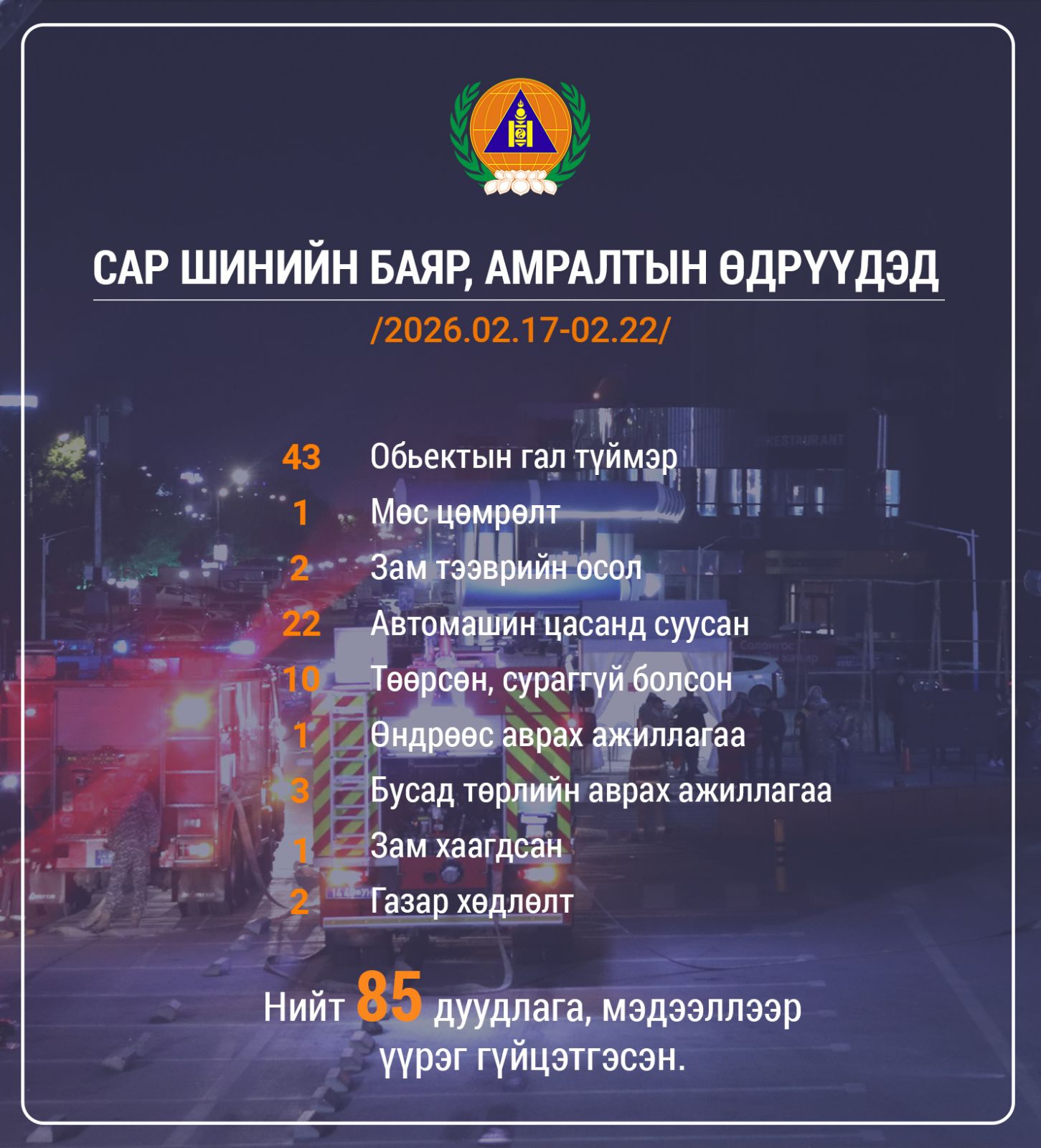 Алба хаагчид гамшиг, аюулт үзэгдэл, ослын 85 удаагийн дуудлагаар ажиллаж, 195 иргэний аюулгүй байдлыг ханган ажиллаж, цасанд суусан 23 автомашиныг татан гаргасан байна.