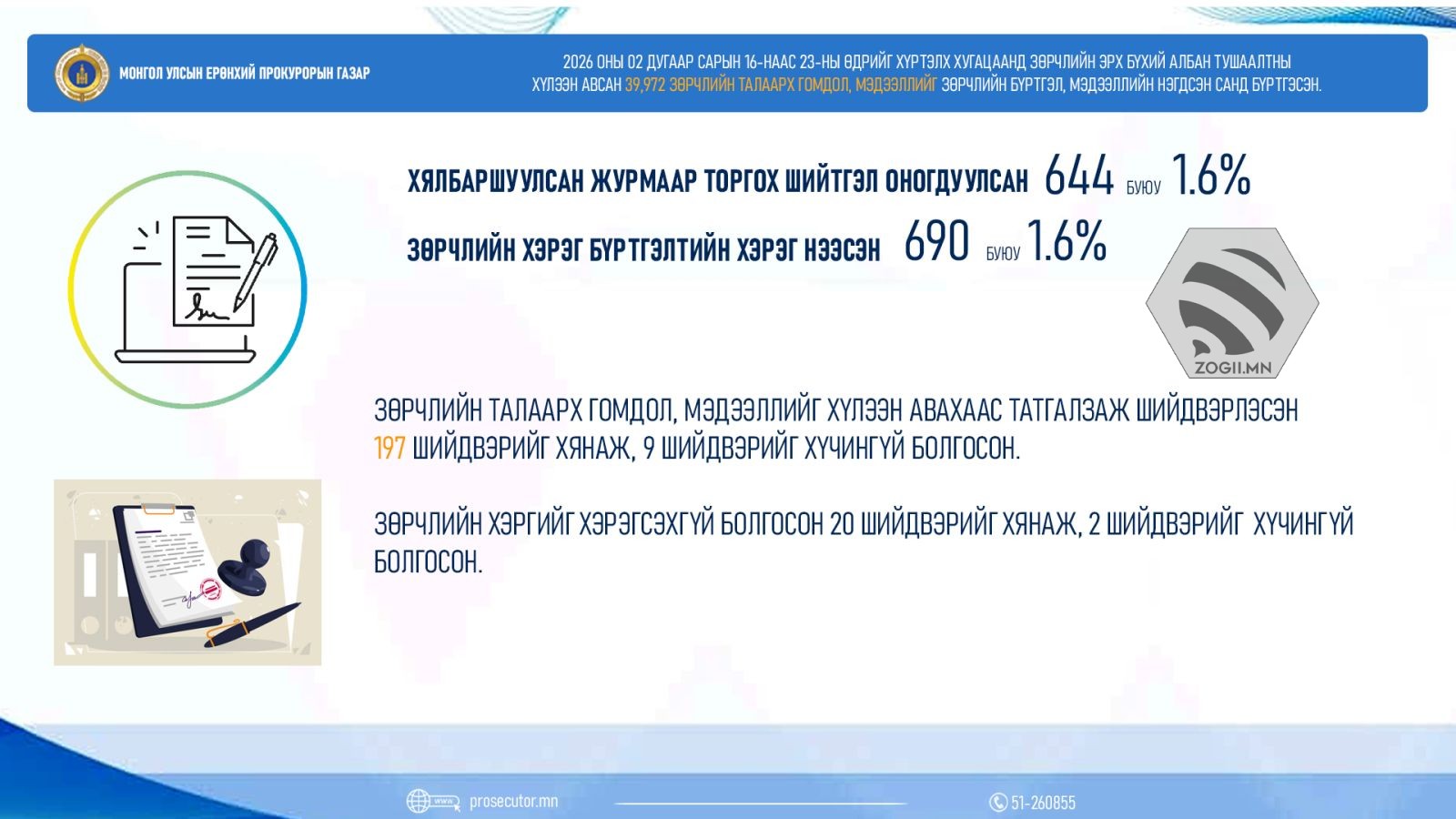 Прокурорын байгууллага 2026 оны 02 дугаар сарын 16-ны өдрөөс 2026 оны 02 дугаар сарын 23-ны өдрийг хүртэл хугацаанд улсын хэмжээнд зөрчил шалган шийдвэрлэх эрх бүхий албан тушаалтны хүлээн авсан 39,942 зөрчлийн талаарх гомдол, мэдээллийг Зөрчлийн бүртгэл, мэдээллийн нэгдсэн санд бүртгэсэн байна.