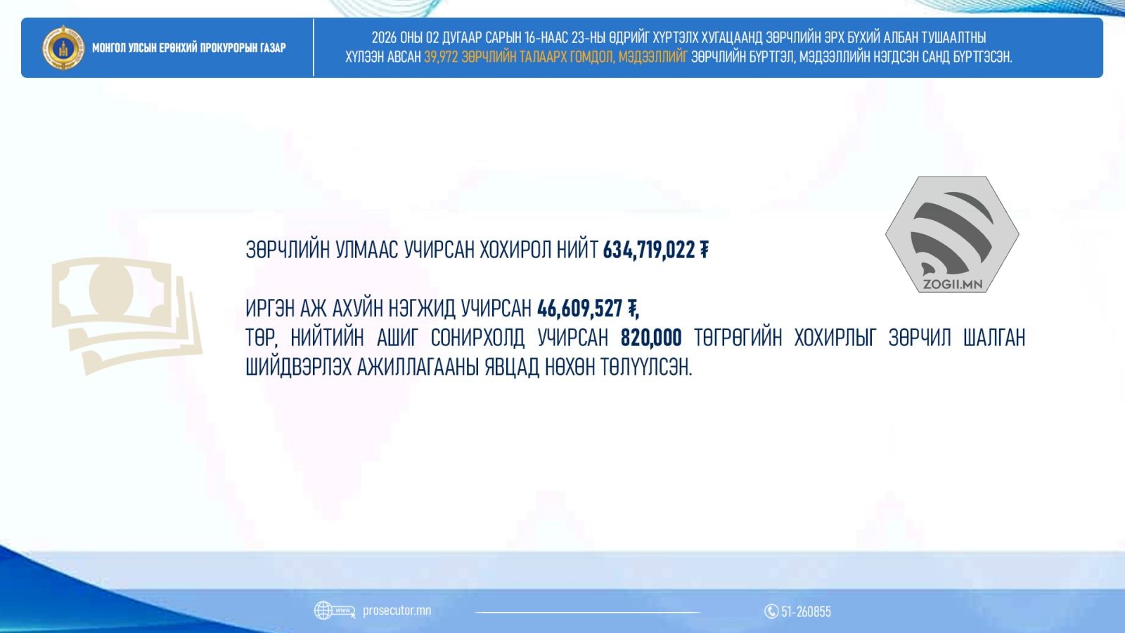 Зөрчлийн улмаас нийт 634,719,022 төгрөгийн хохирол учирснаас 7.4 хувийг буюу иргэн, аж ахуйн нэгжид учирсан 46,309,527 төгрөг, төр, нийтийн ашиг сонирхолд учирсан 820,000 төгрөгийн хохирлыг зөрчил шалган шийдвэрлэх ажиллагааны явцад нөхөн төлүүлсэн байна.