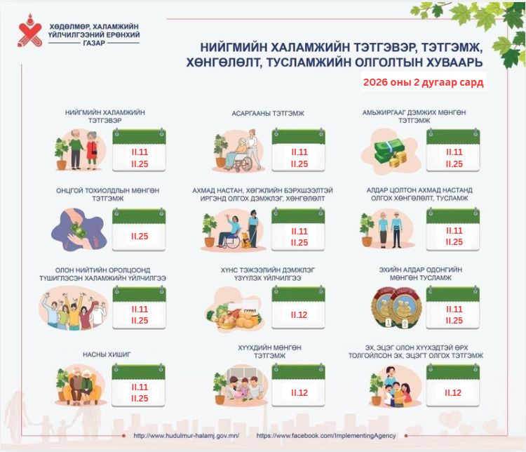 Өнөөдөр буюу хоёрдугаар сарын 25-ны өдөр тэтгэвэр, асаргааны тэтгэмж, амьжиргааг тэтгэх мөнгөн тэтгэмж, онцгой тохиолдлын мөнгөн тэтгэмж, ахмад настан, хөгжлийн бэрхшээлтэй иргэнд олгох дэмжлэг, хөнгөлөлт, алдар цолтон ахмад настанд олгох хөнгөлөлт, тусламж, олон нийтийн оролцоонд түшиглэсэн халамжийн үйлчилгээ, Эхийн алдар одонгийн мөнгөн тусламж, насны хишиг олгогдох хуваарьтай байна.