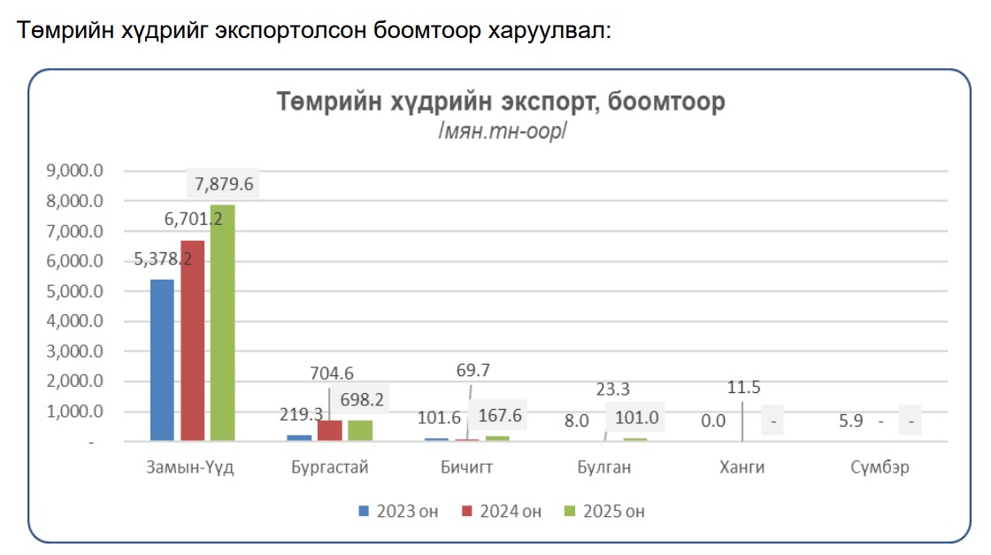 2025 онд 637.9 сая ам.долларын 8846.4 мян.тн төмрийн хүдэр экспортолсныг өнгөрсөн 2 жилийн мэдээлэлтэй харьцуулахад 2023 оны мөн үеэс тоо хэмжээгээр 3133.4 мянган тонноор, үнийн дүн 193.1 сая ам.доллараар, 2024 оны мөн үеэс 1336.1 мянган тонноор, үнийн дүн 40.3 сая ам.доллараар тус тус өссөн байна.