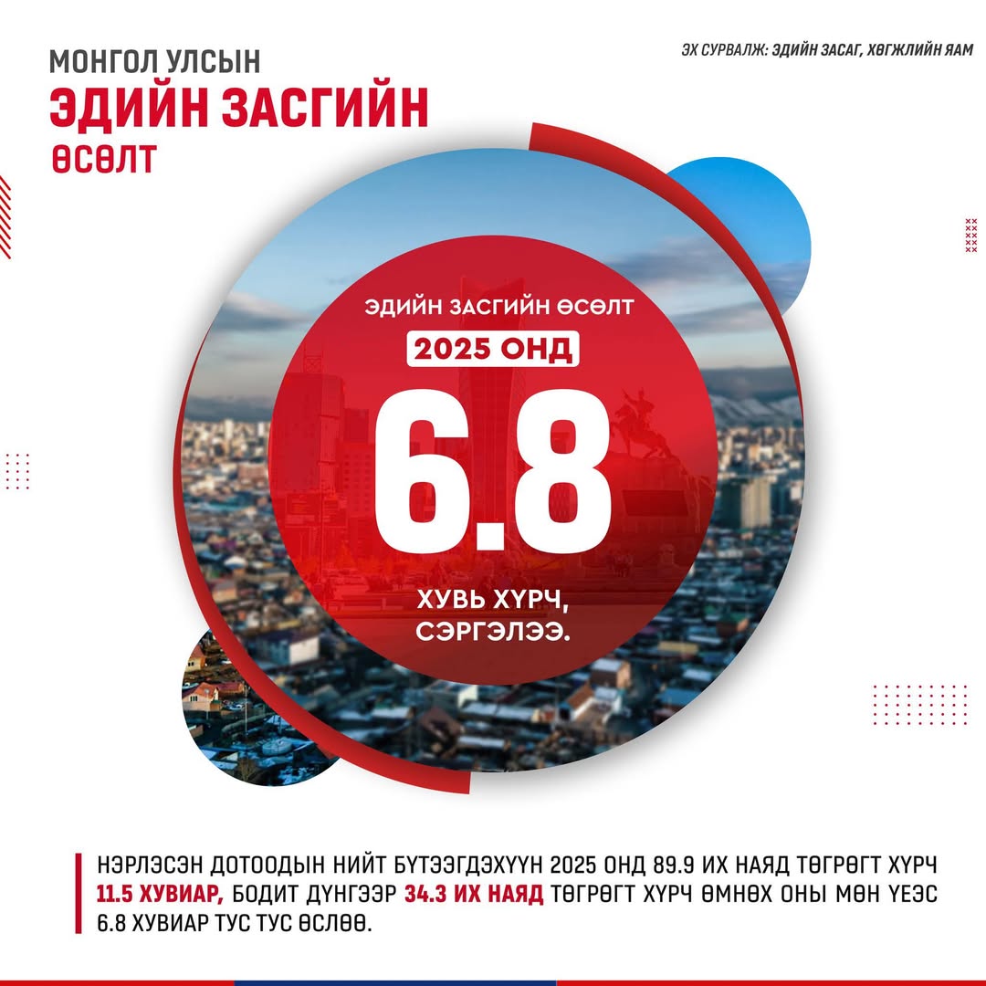 Бодит өсөлтөөр тооцвол ДНБ 34.3 их наяд төгрөг болж, 6.8 хувиар өслөө.