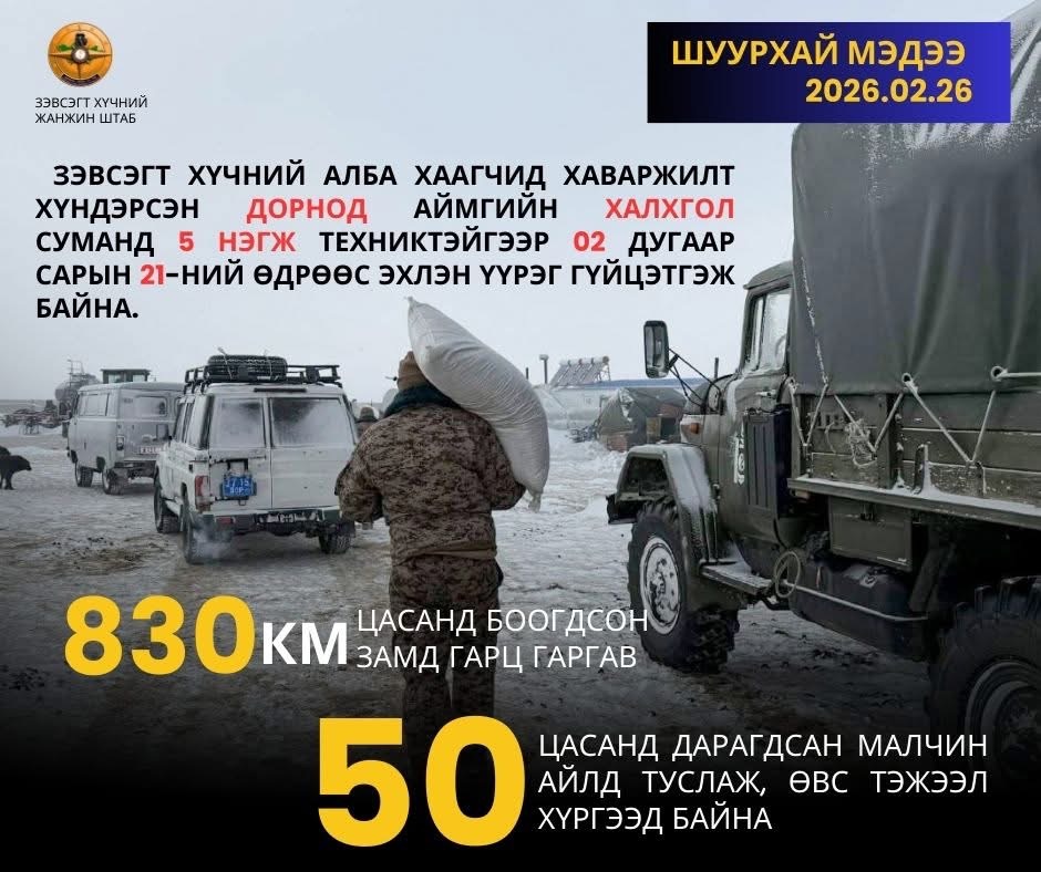 Дорнод аймгийн Халхгол суманд их хэмжээний цасаар шуурсны улмаас үүссэн гамшгийн хор уршгийг арилгахаар Зэвсэгт хүчний 327 дугаар ангийн 20 цэргийн алба хаагч, Зэвсэгт хүчний 065 дугаар ангийн 329 дүгээр салбарын 6 цэргийн алба хаагч нийт таван нэгж техниктэйгээр ажиллаж байгаа билээ.