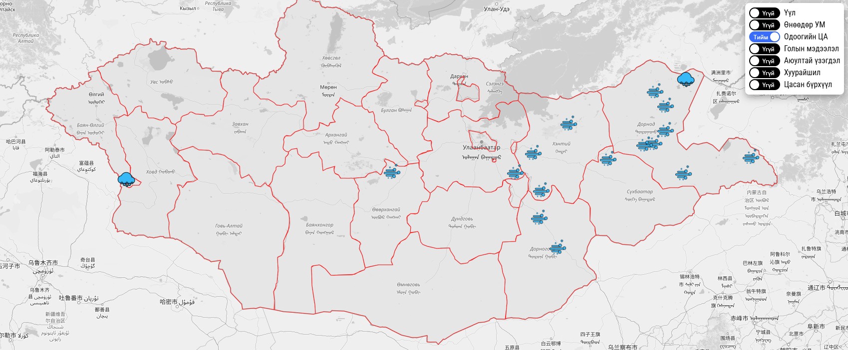 2026 оны 3-р сарын 3-ны 08:00 цагийн байдлаар ажиглагдаж буй цаг агаарын үзэгдлийн мэдээллийг хүргэж байна.