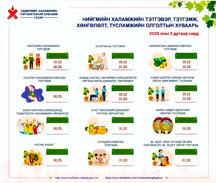 Нийгмийн халамжийн тэтгэвэр, тэтгэмж, хөнгөлөлт, тусламжийн 2026 оны 03 дугаар сарын олголтын хуваарийг танилцуулж байна.