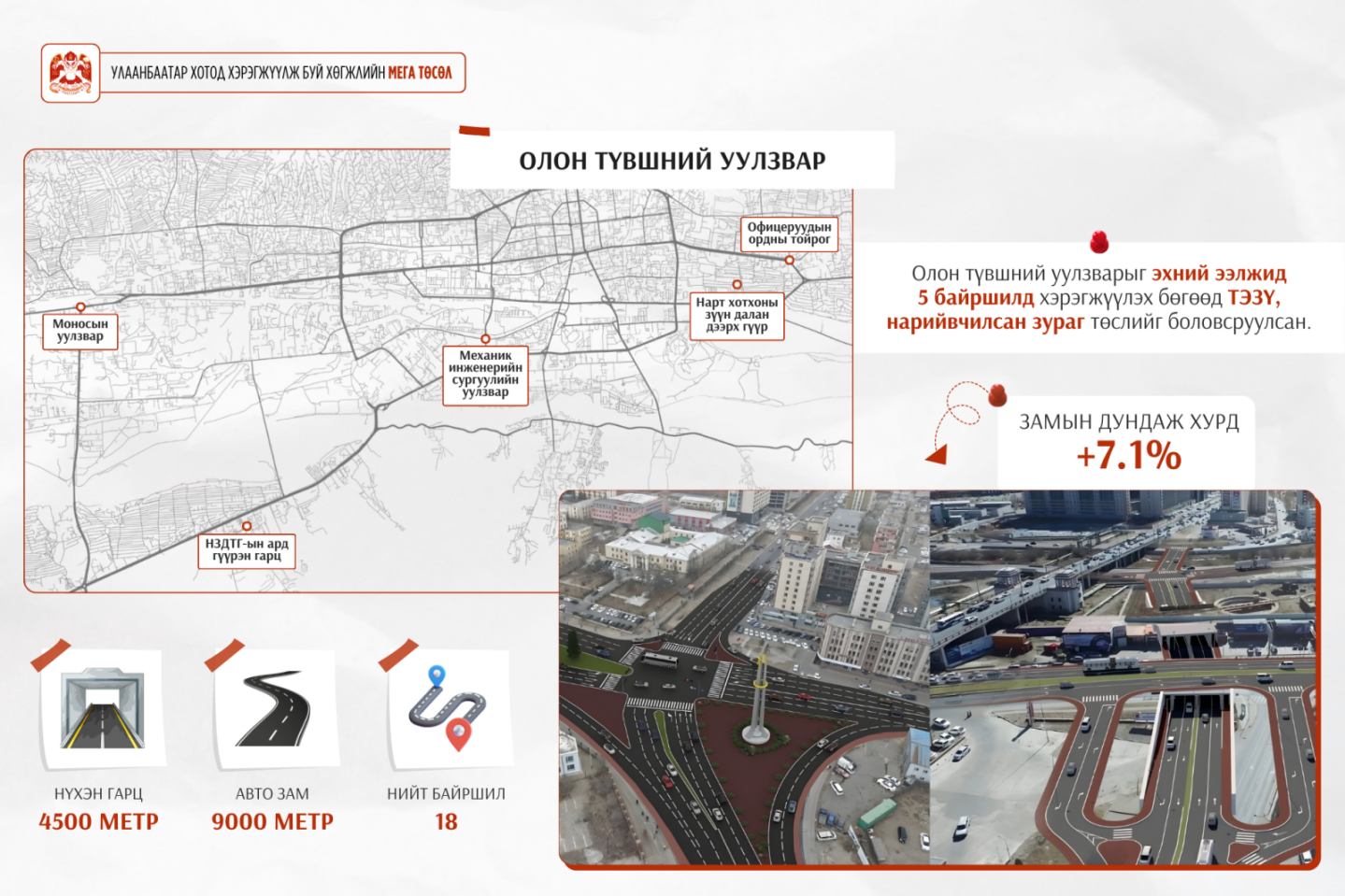 Улаанбаатар хотын авто замын түгжрэлийг бууруулах, замын хөдөлгөөний нэвтрэх чадварыг нэмэгдүүлэх зорилтын хүрээнд “Олон түвшний уулзвар” төслийг 2025-2028 онд үе шаттай хэрэгжүүлнэ. Тус төсөл нь Монгол Улсын урт болон дунд хугацааны хөгжлийн бодлоготой уялдсан бөгөөд хотын үндсэн болон гол гудамж, замуудын огтлолцлоос үүдэлтэй саатлыг инженерийн цогц шийдлээр бууруулахад чиглэж буй.